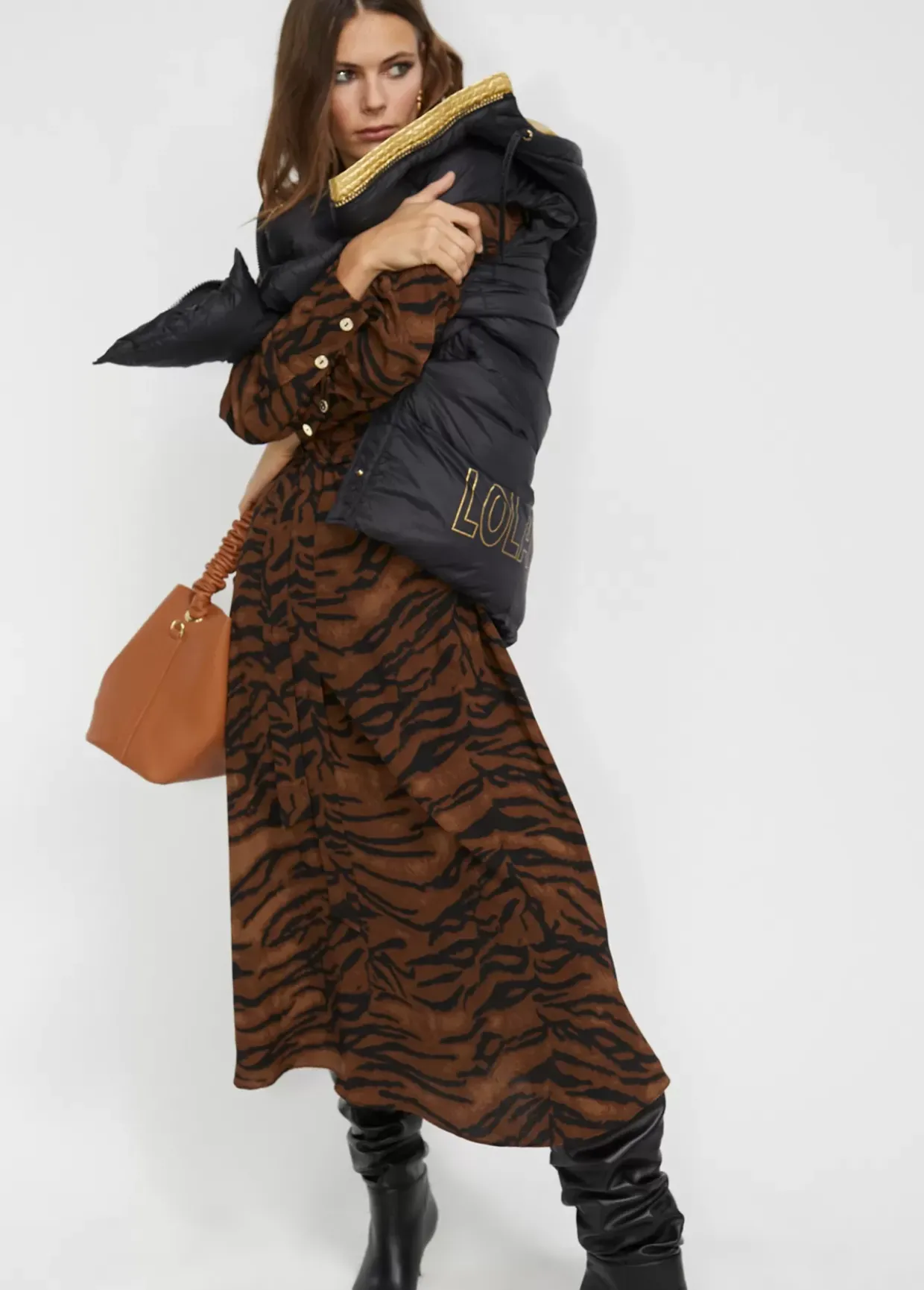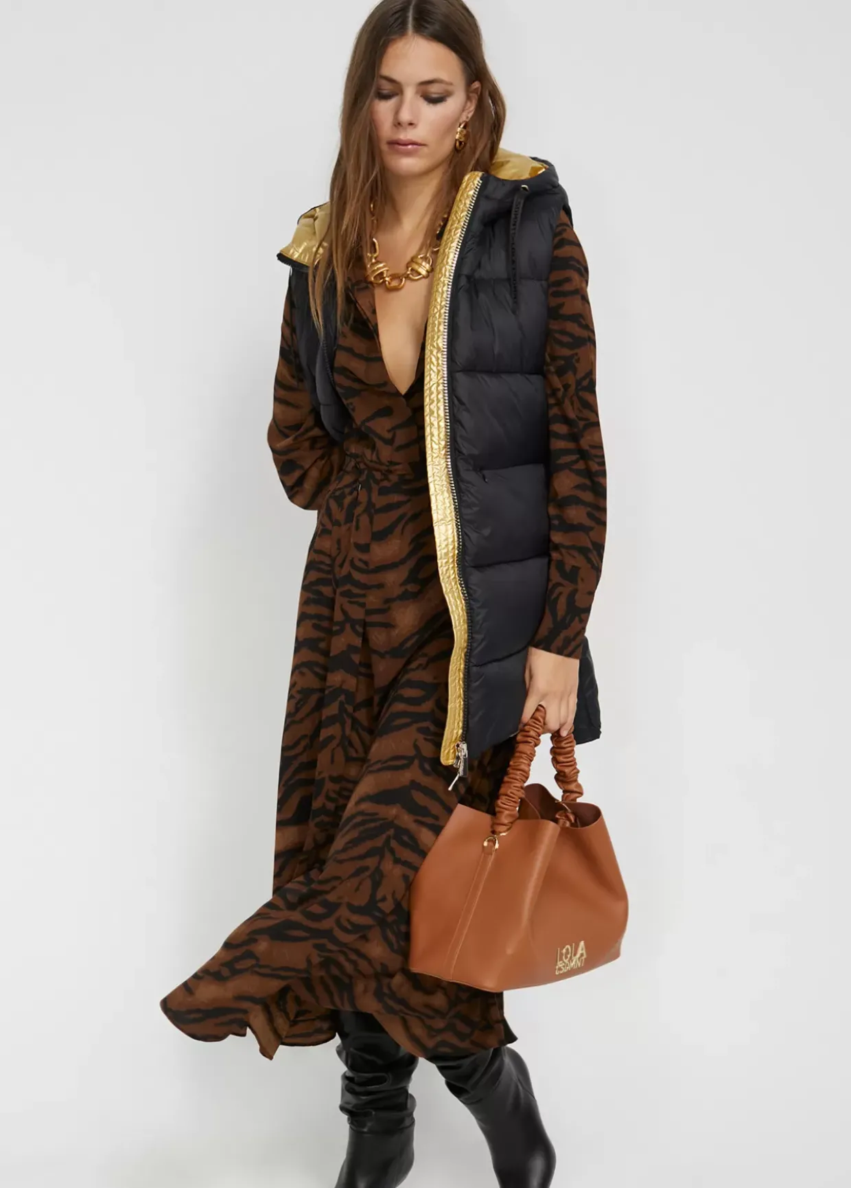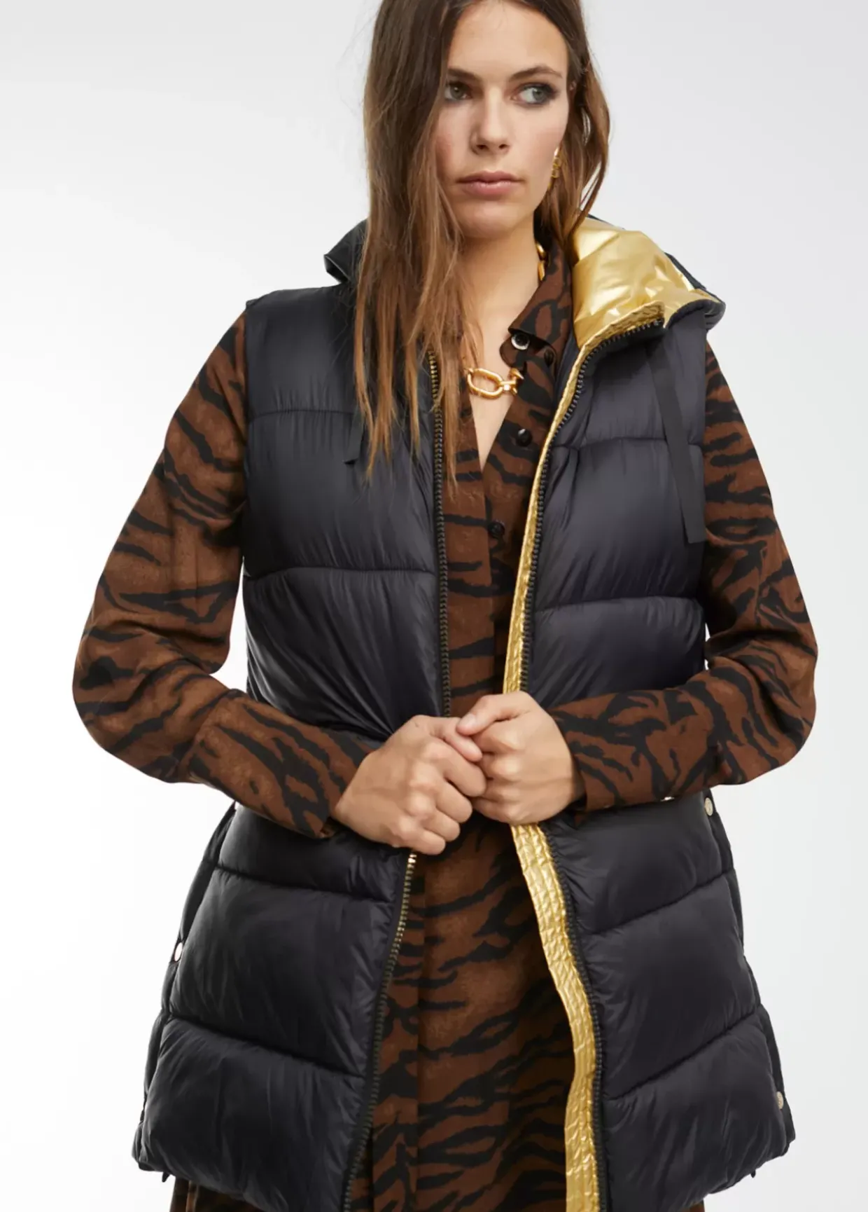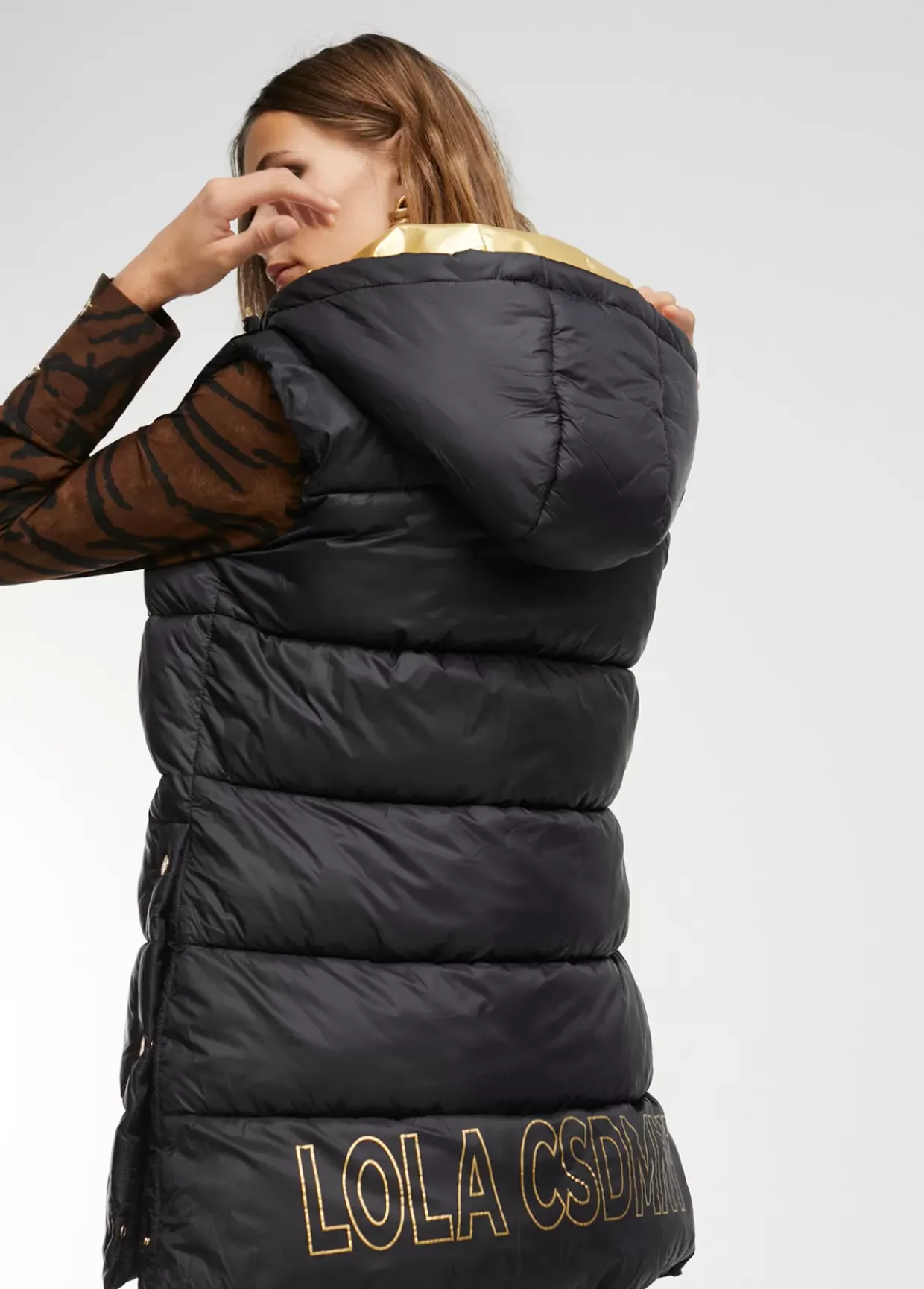 Chaleco acolchado de largo medio. Interior capucha en dorado. Cierre con cremallera de doble carro con detalle en dorado. Aberturas laterales en bajos. Logo serigrafiado contrastado en bajo espalda.