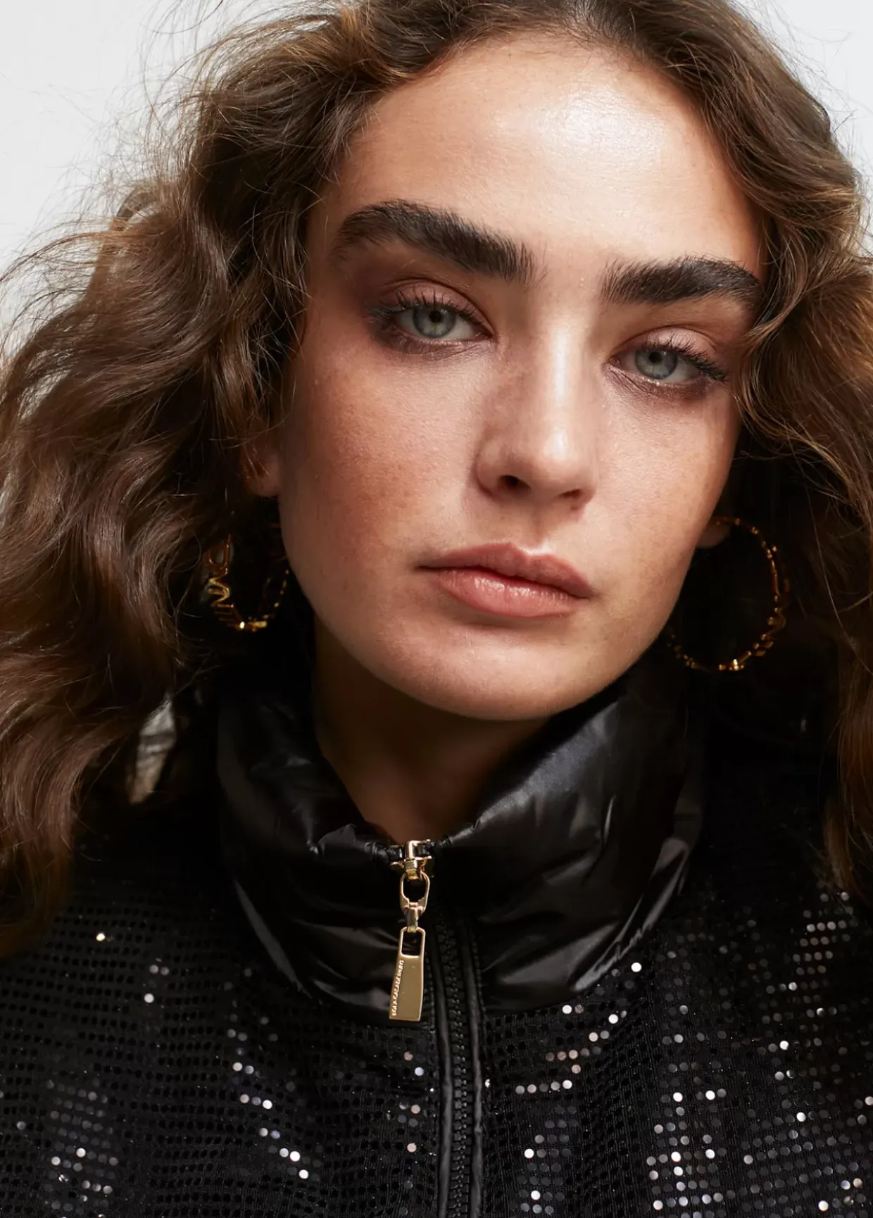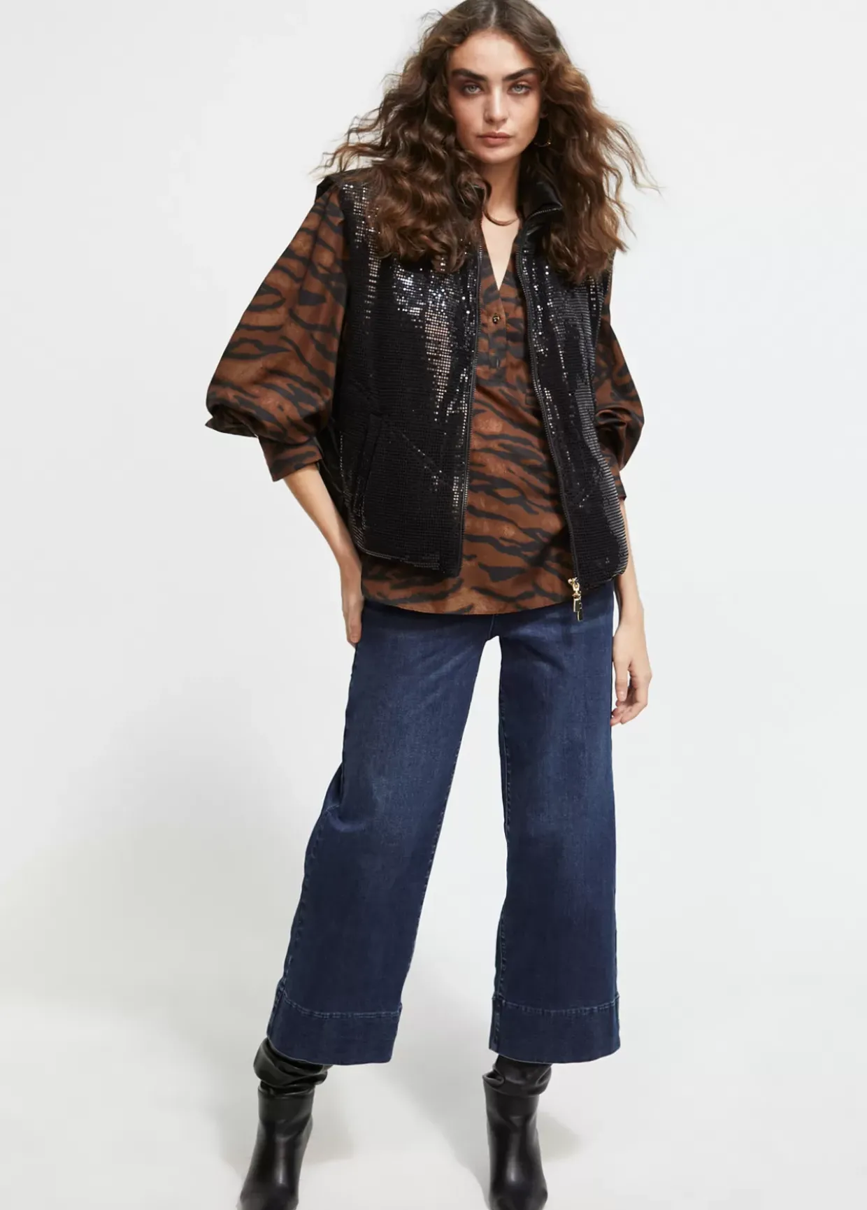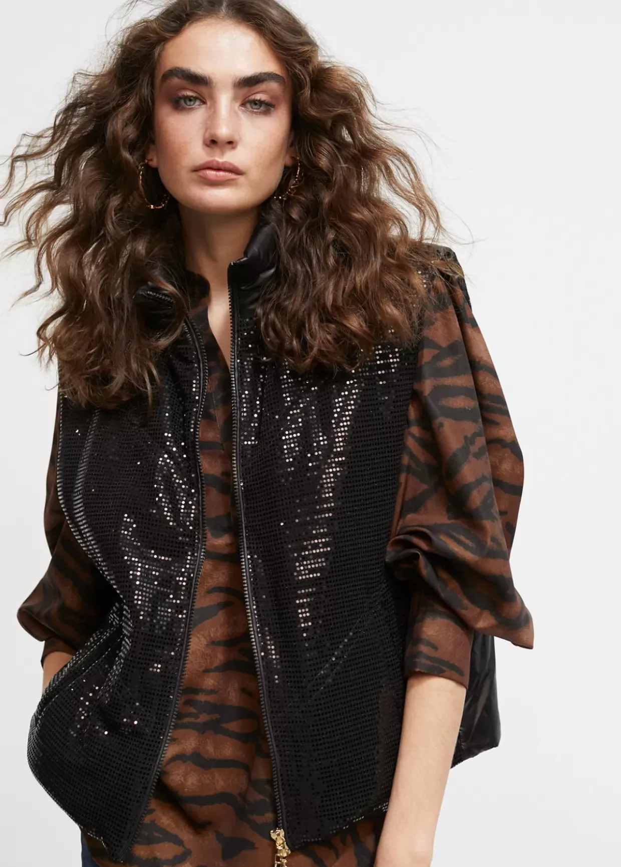Chaleco corto en tejido efecto lentejuela. Cierre con cremallera de doble carro. Bolsillos laterales.