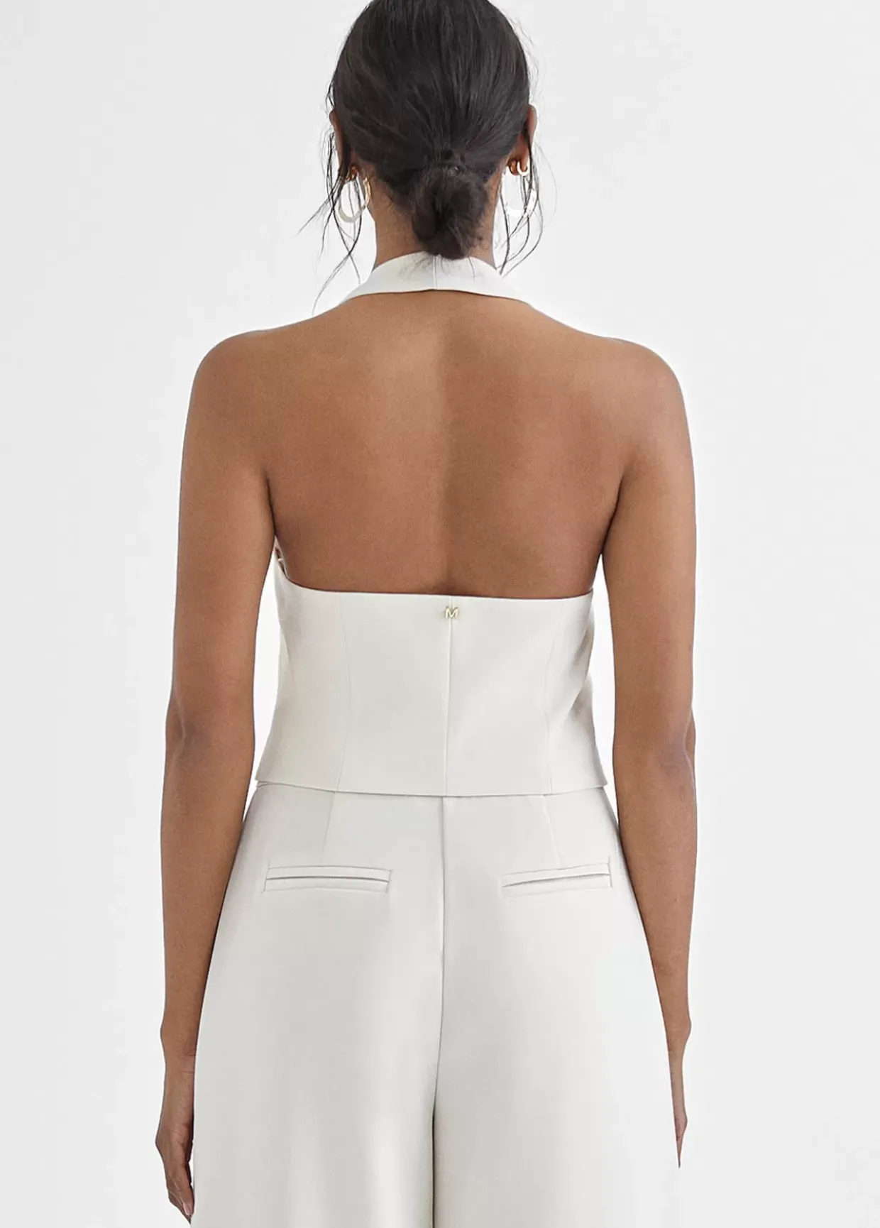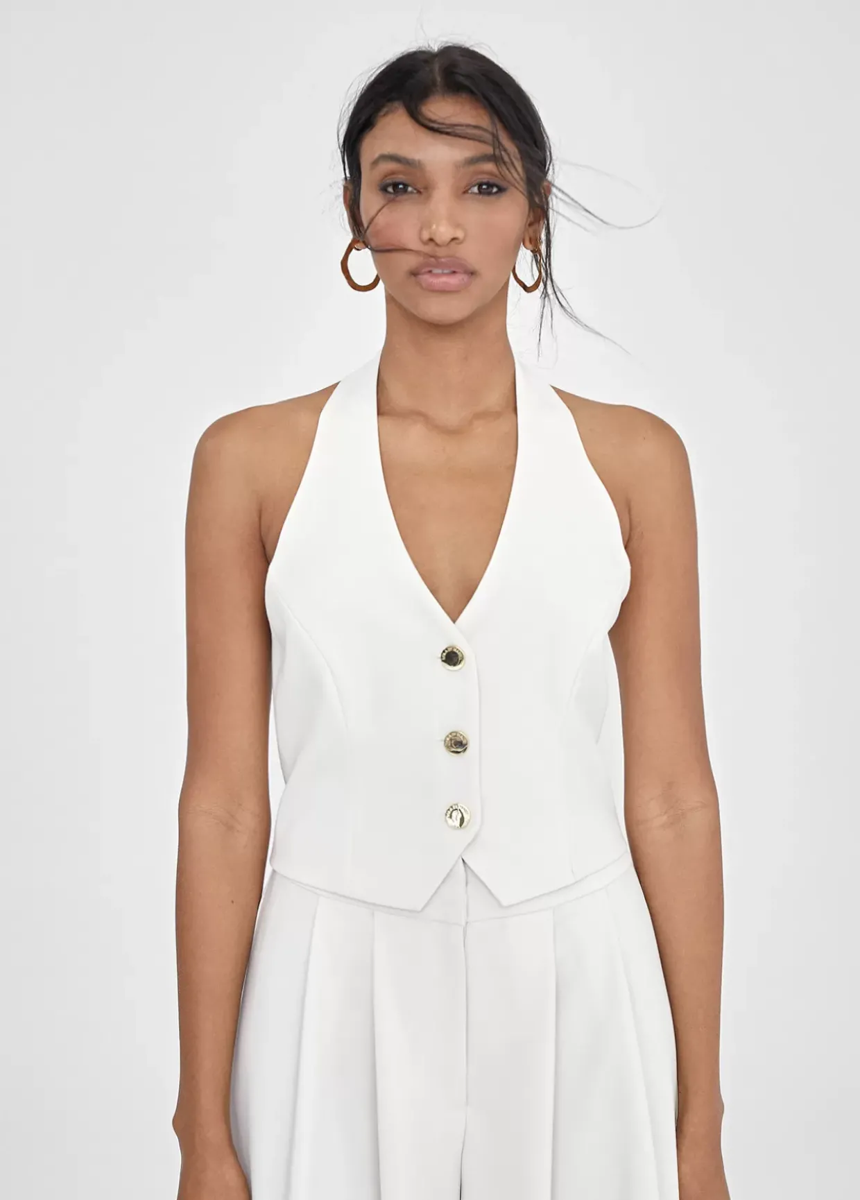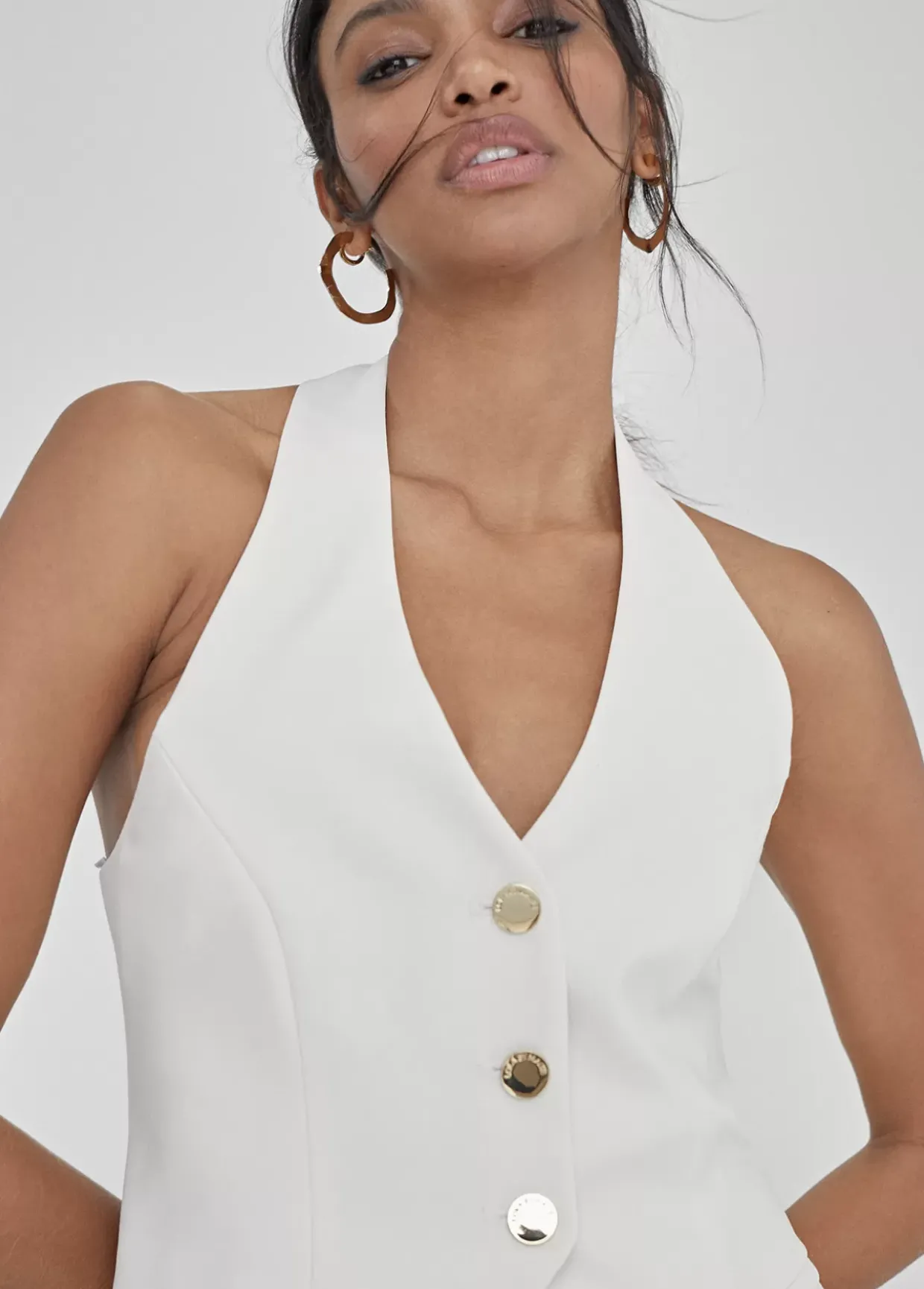 Chaleco entallado con la espalda descubierta. Cerrado delantero con botones dorados logotipados.