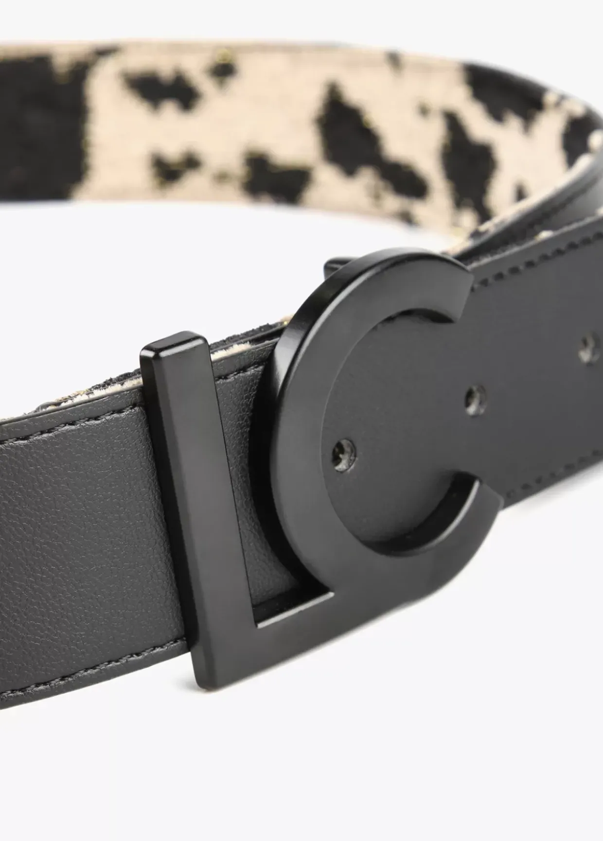 Cinturón efecto piel tejido animal y negro. Letras logo lacadas en negro a modo de hebilla.