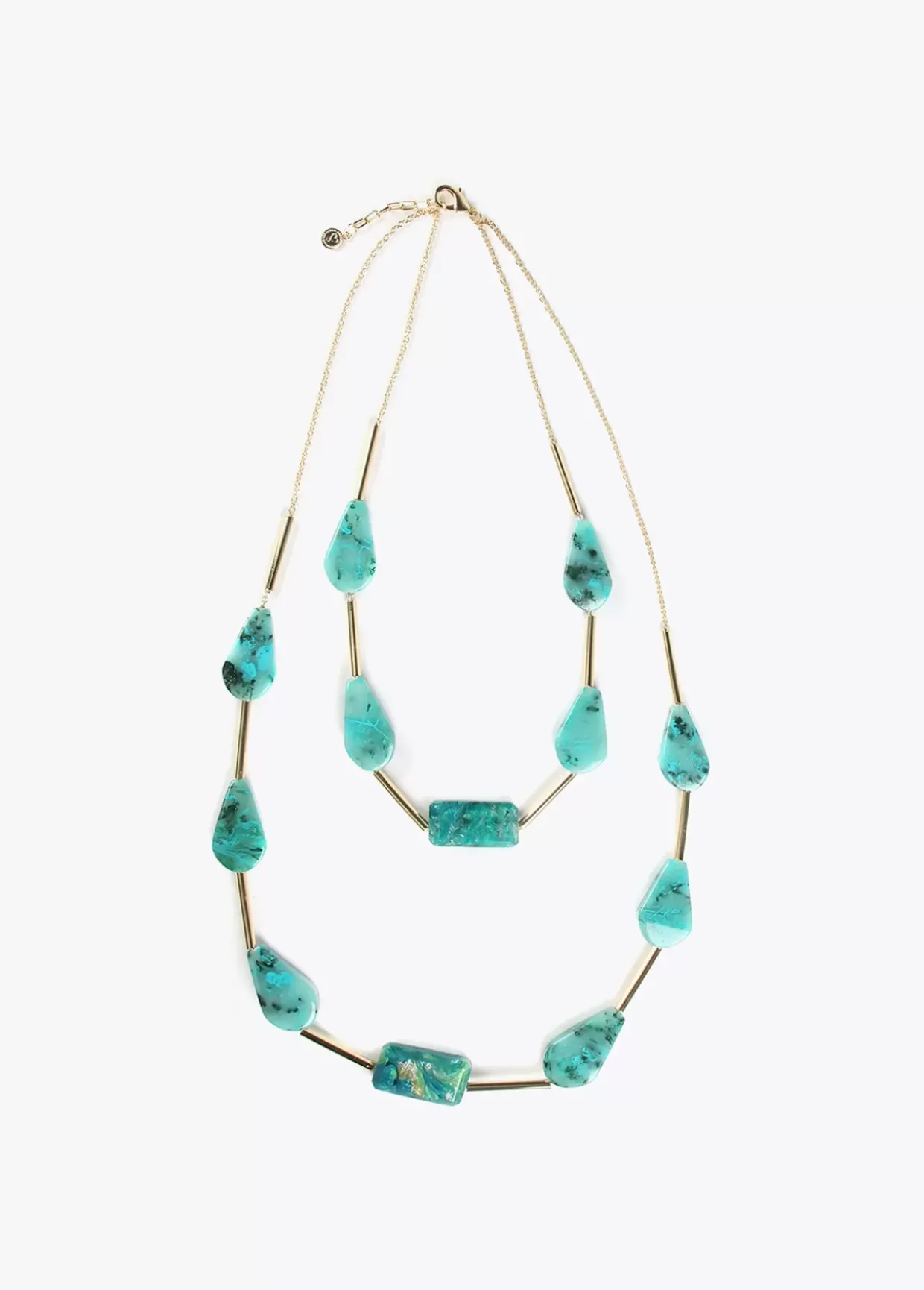 Collar doble con maxi piezas en color turquesa combinadas con detalles dorados. Cierre ajustable y medallita logotipada.