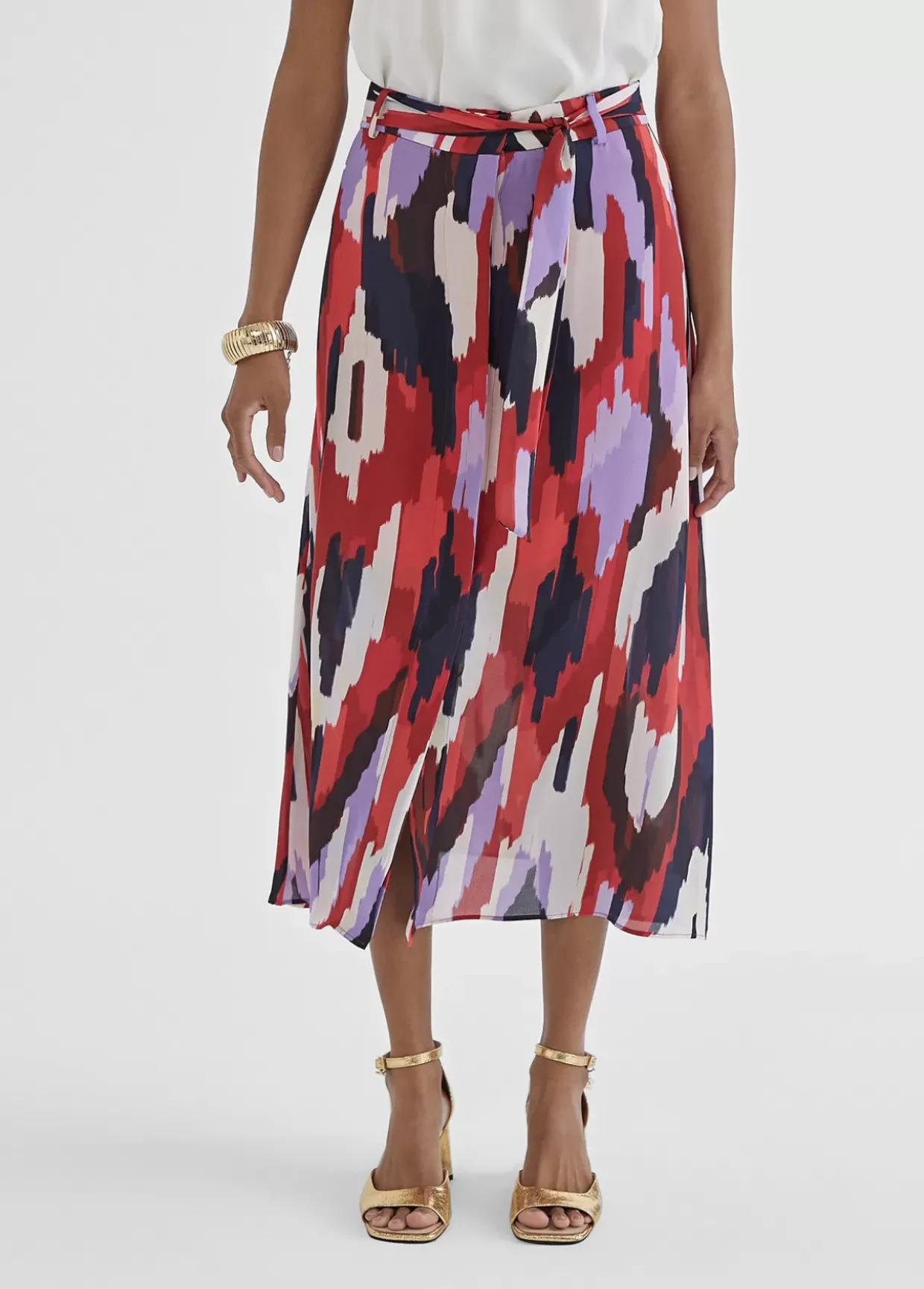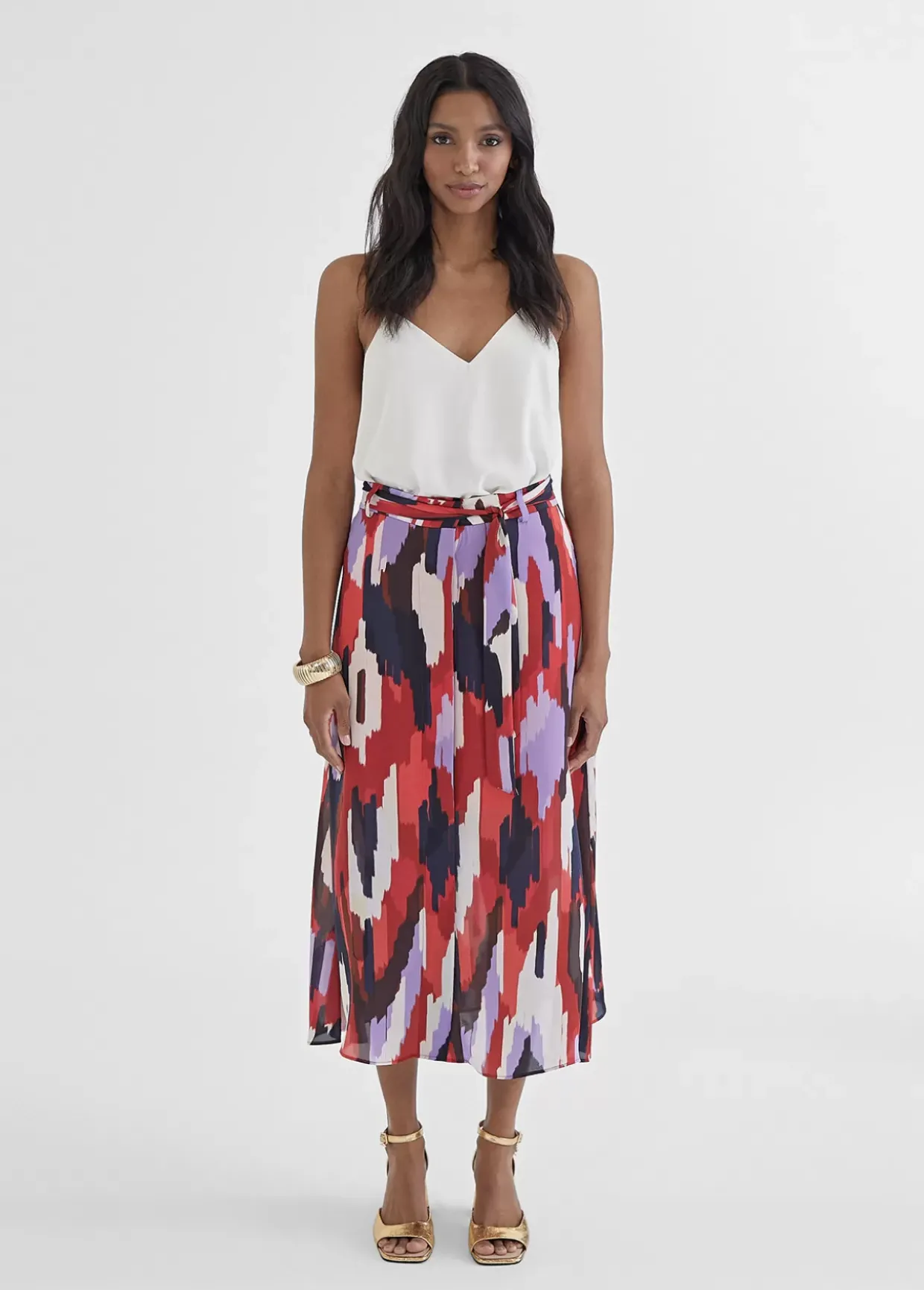 Falda fluida estampada en diferentes tonos combinados. Detalle tira cinturón.