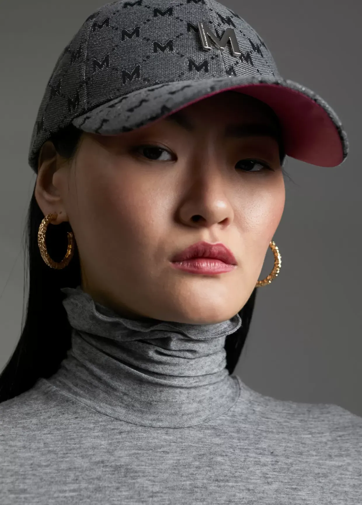 Gorra color gris con monograma y detalle letra logo plateada en parte frontal. Ajustable.