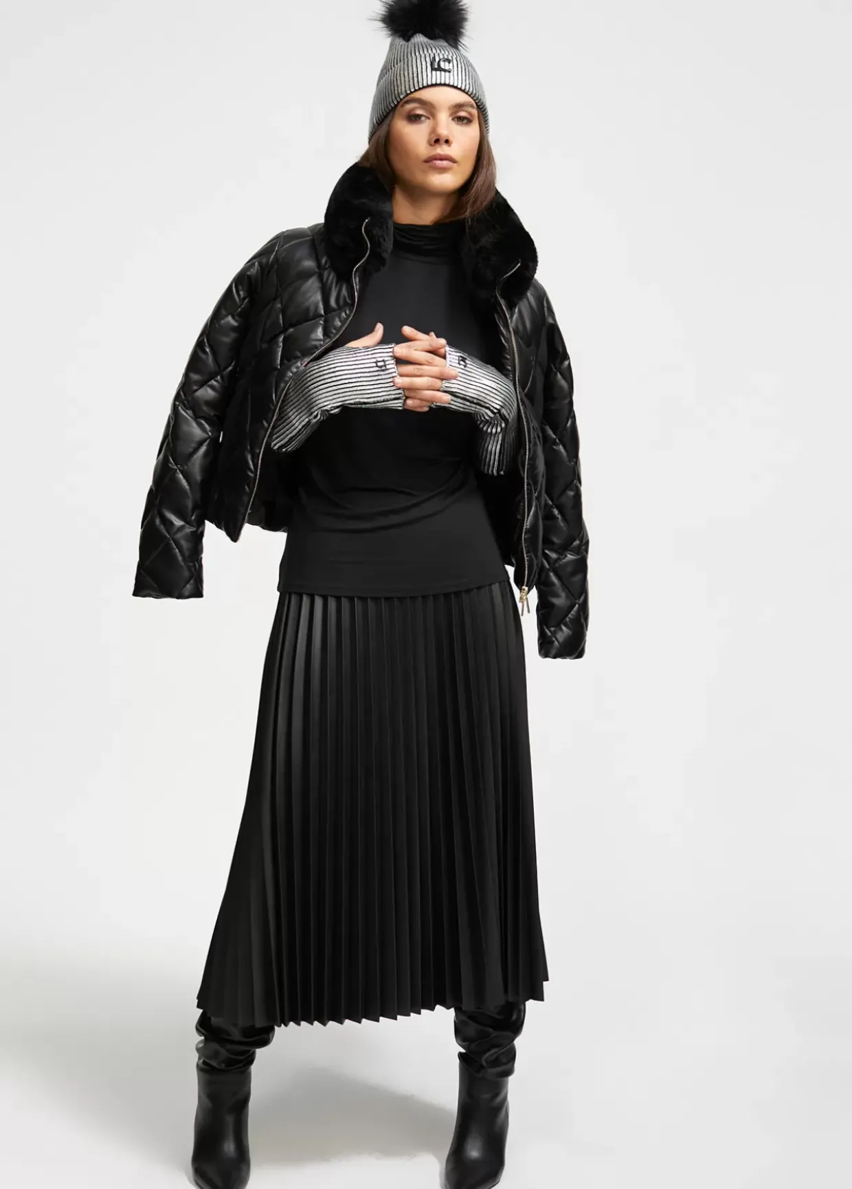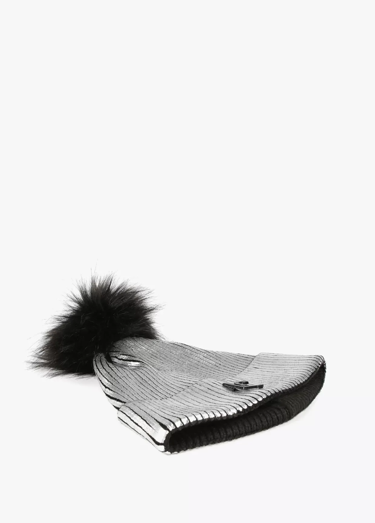 Gorro de tricot platerado con maxi pompón efecto pelo y letras logo lacadas en parte frontal.