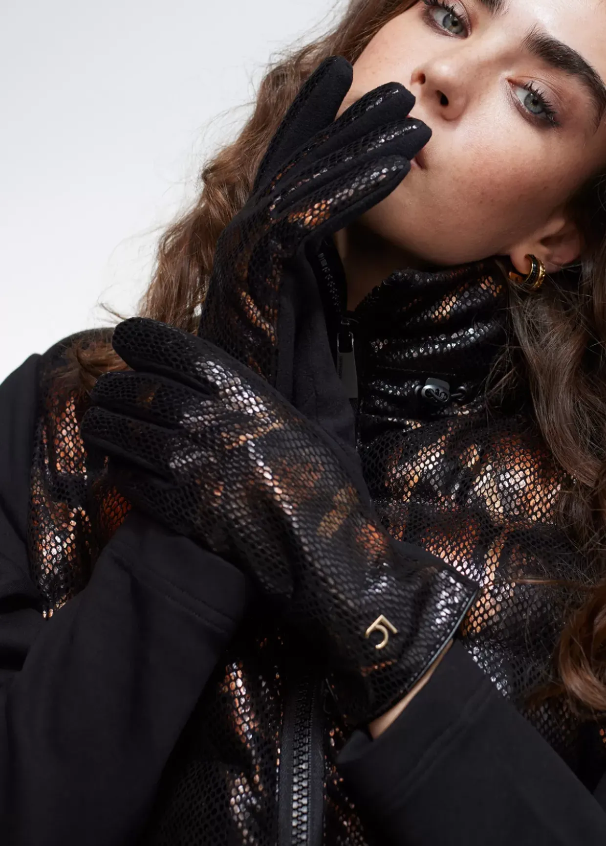 Guantes en animal print metalizado efecto serpiente. Letras logo doradas en parte frontal.