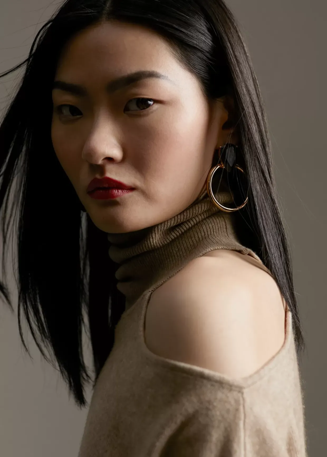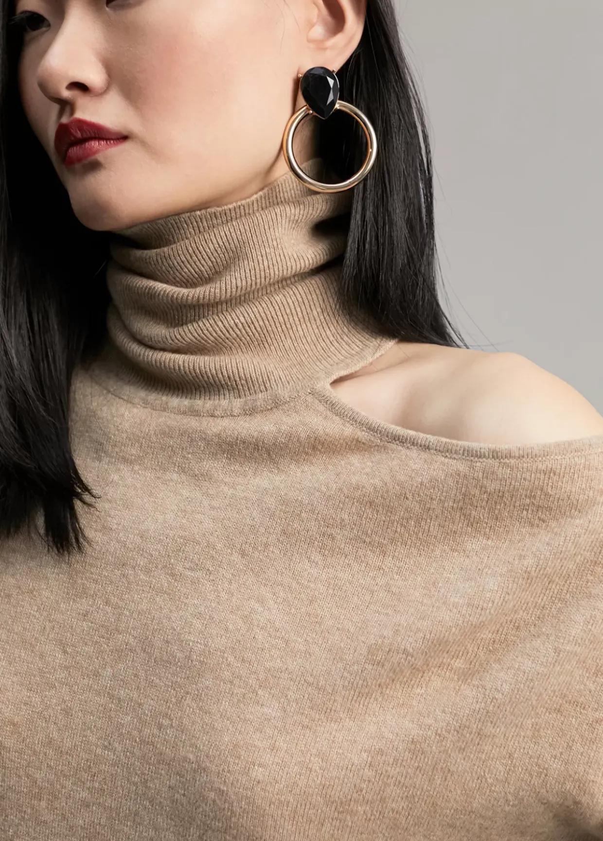 Jersey cuello alto y manga larga. Detalle de abertura en hombro.