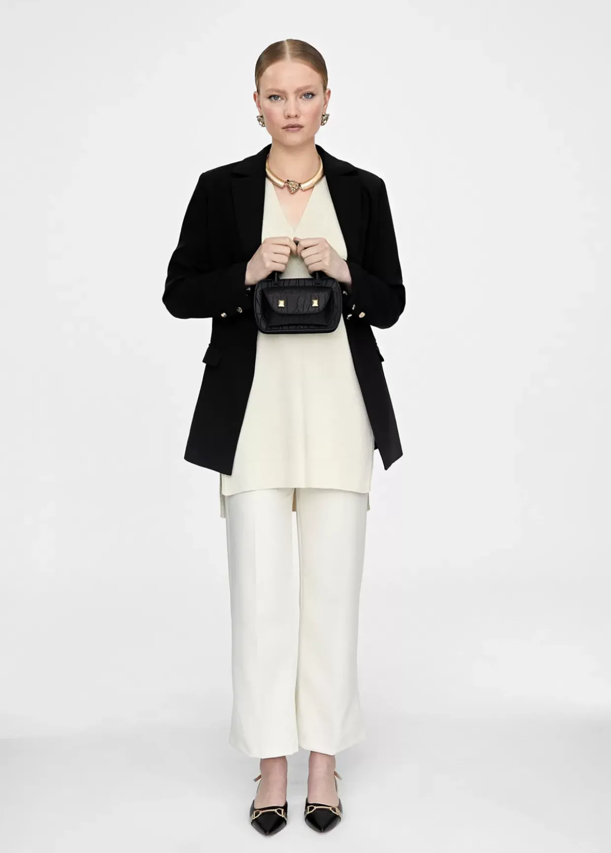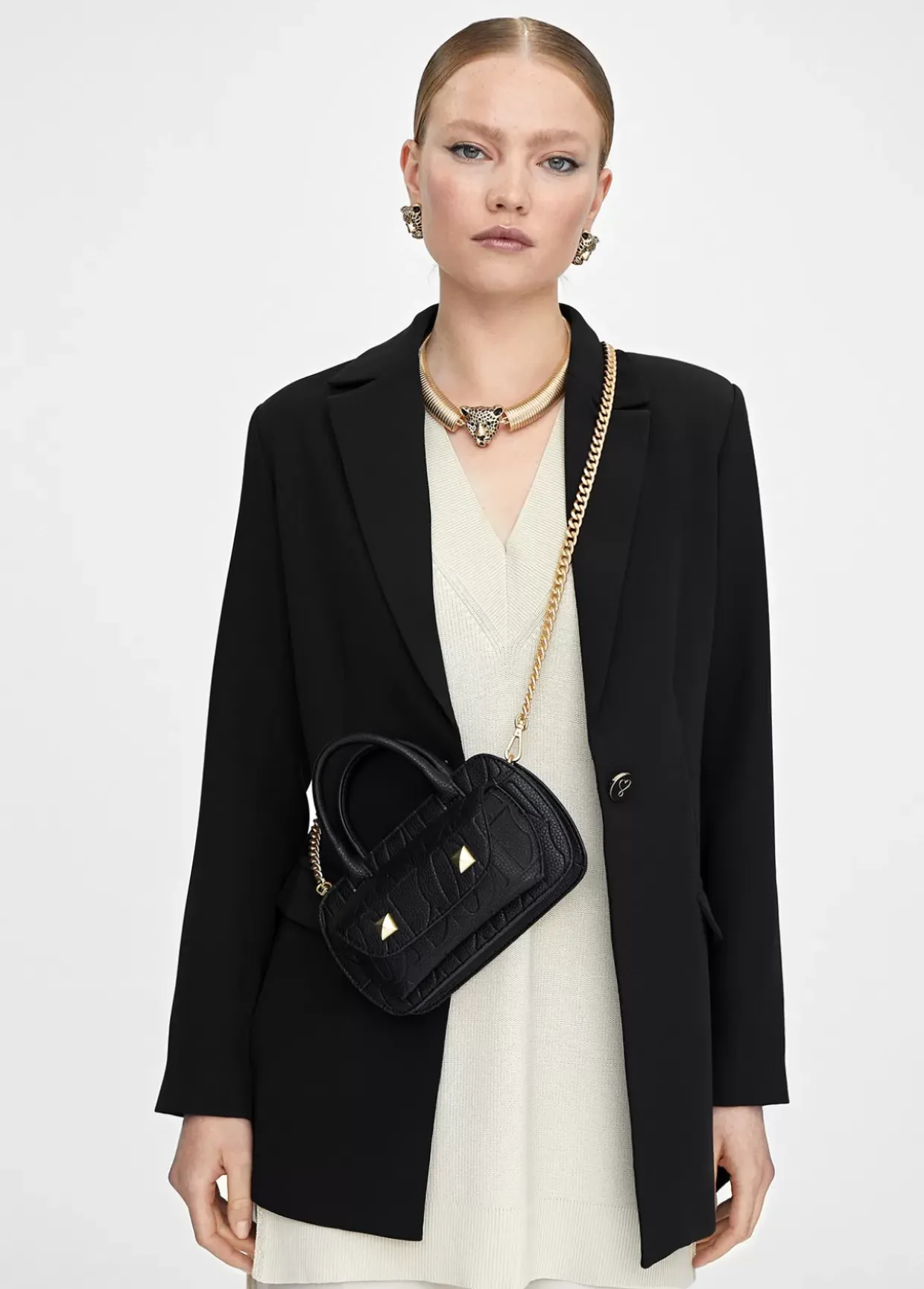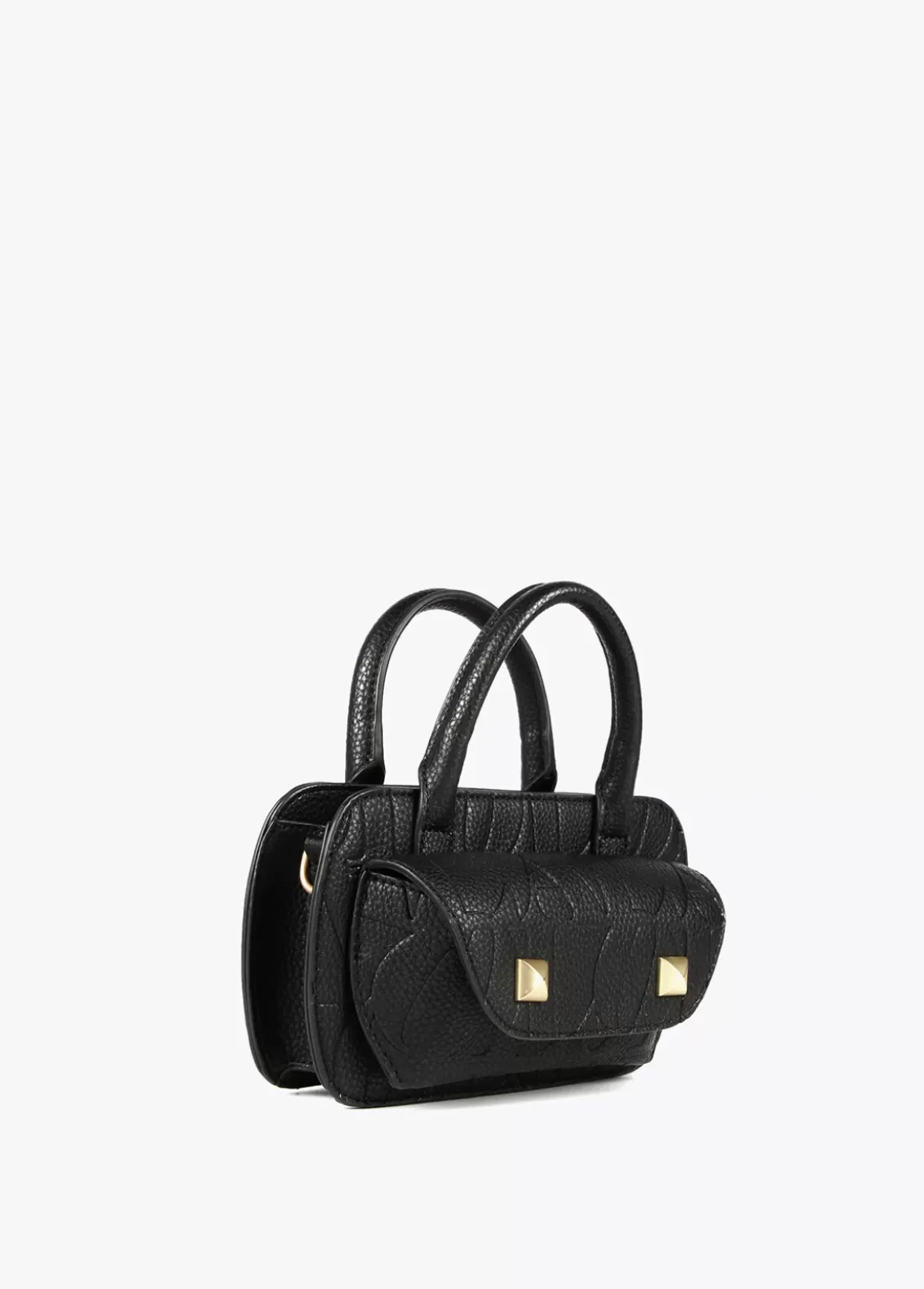 Bolso mini bandolera en efecto piel con logo grabado y detalles dorados. Asas de mano y asa bandolera de cadena dorada extraible. Compartimento exterior logotipo dorado en parte trasera. Cierre con lengüeta y botón. Bolsillo interior con cremallera.
