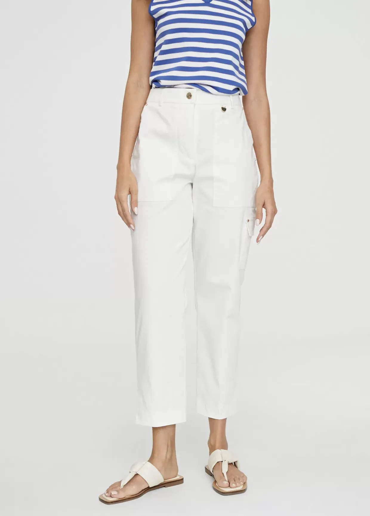 Pantalón de largo tobillero. Bolsillos laterales y cerrado con cremallera frontal y botón dorado. Bolsillo plastrón con solapa en pernera lateral.