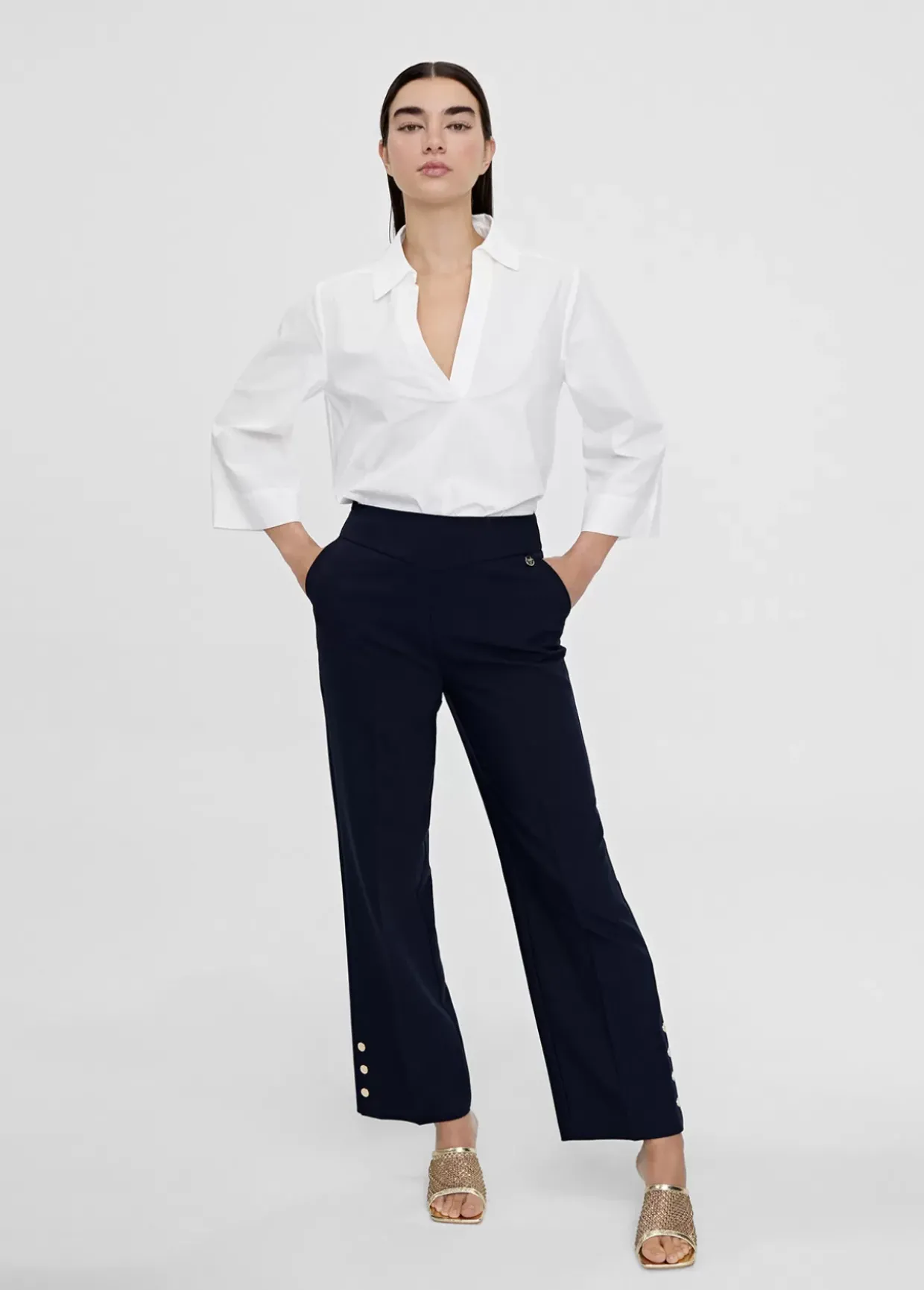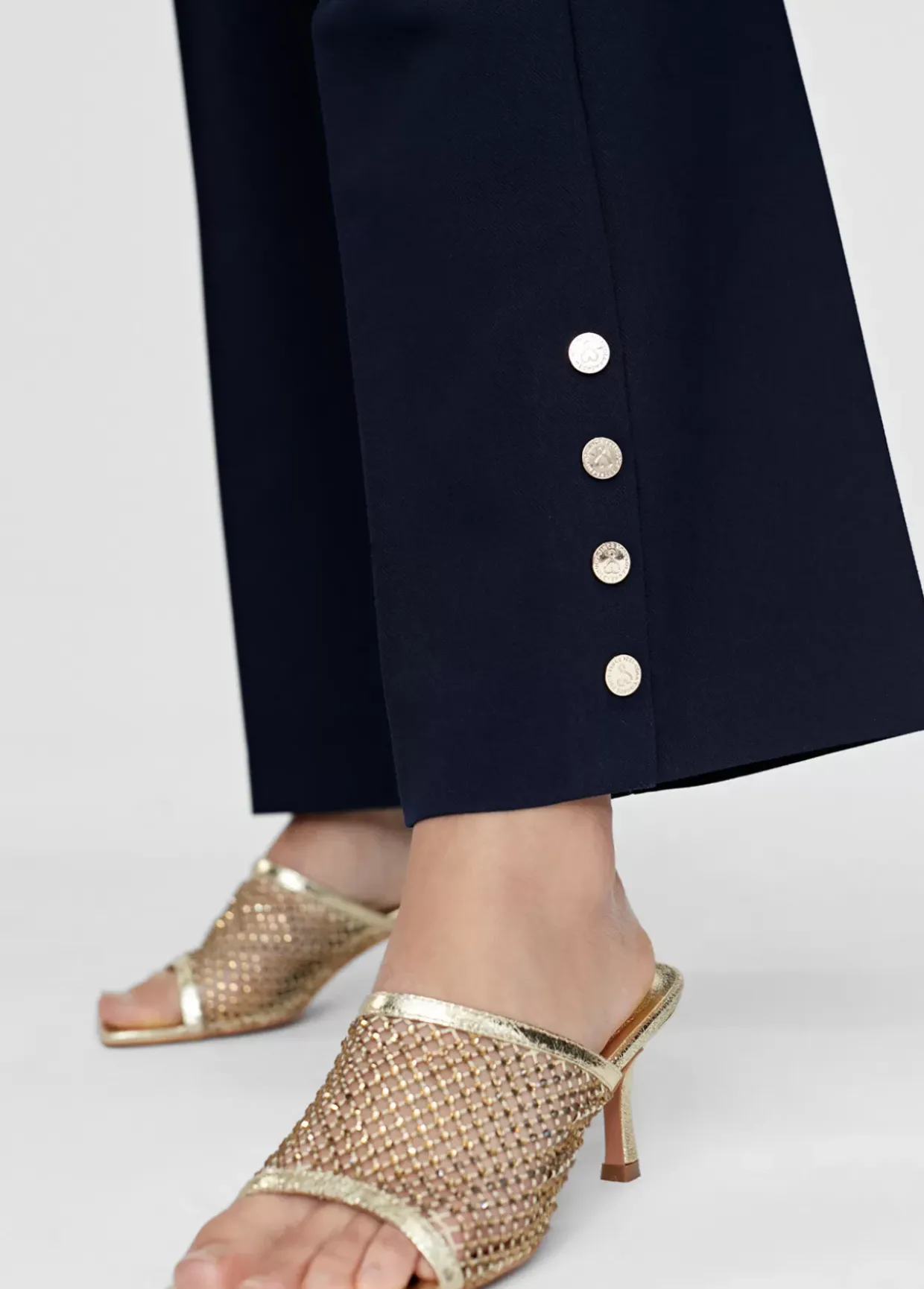 Pantalón recto mono color. Bolsillos laterales. Cierre con cremallera lateral. Bajo con botones dorados.