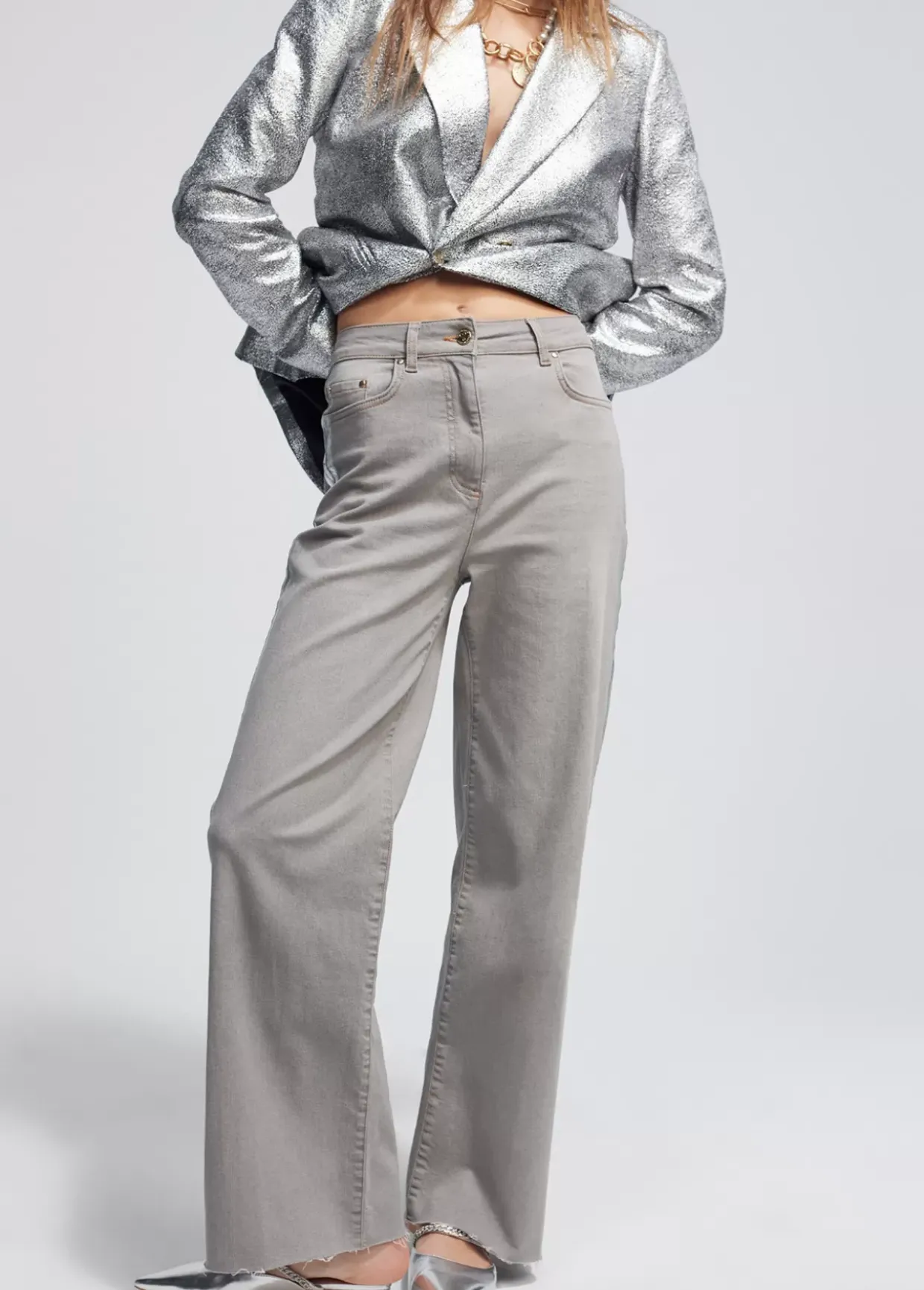 Pantalón tejano de tiro alto y pierna ancha. Cerrado con cremallera frontal. Bolsillos delanteros y traseros tipo plastrón. Detalle de banda laminada plateada en lateral perneras.