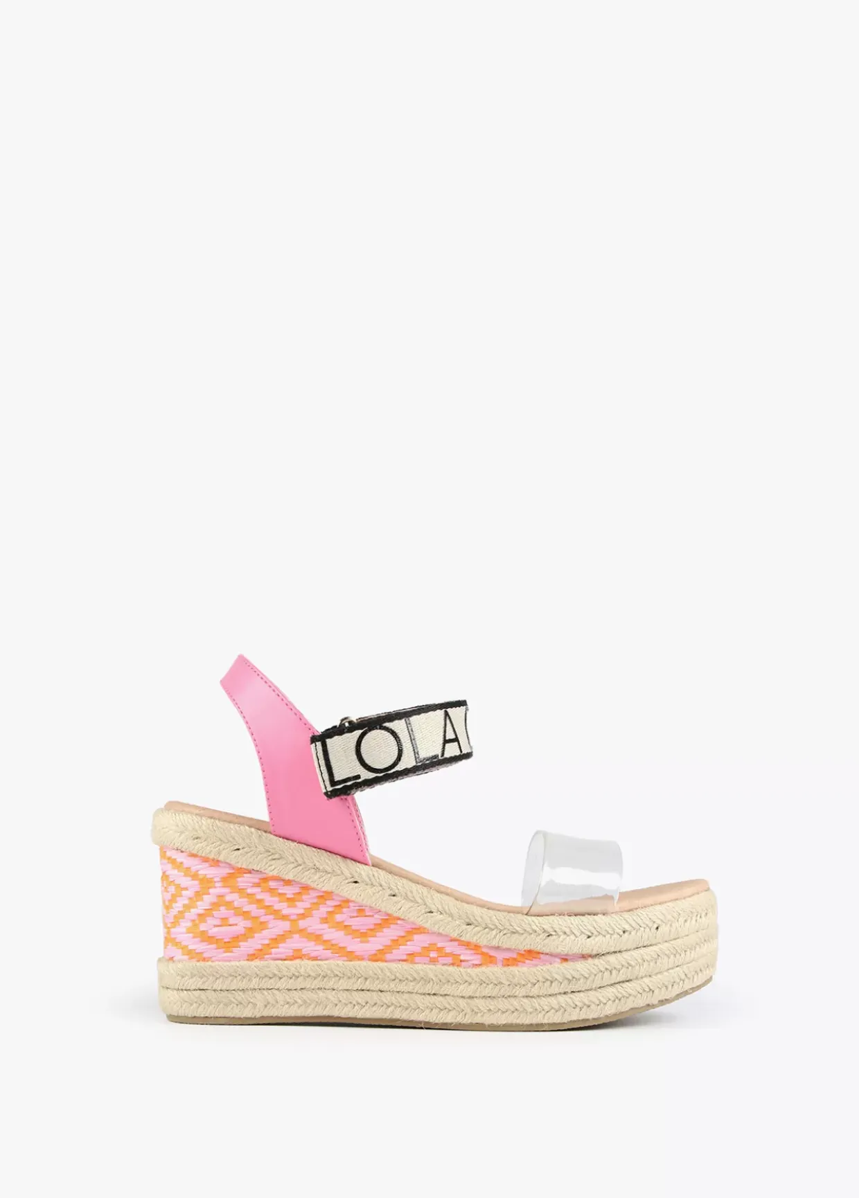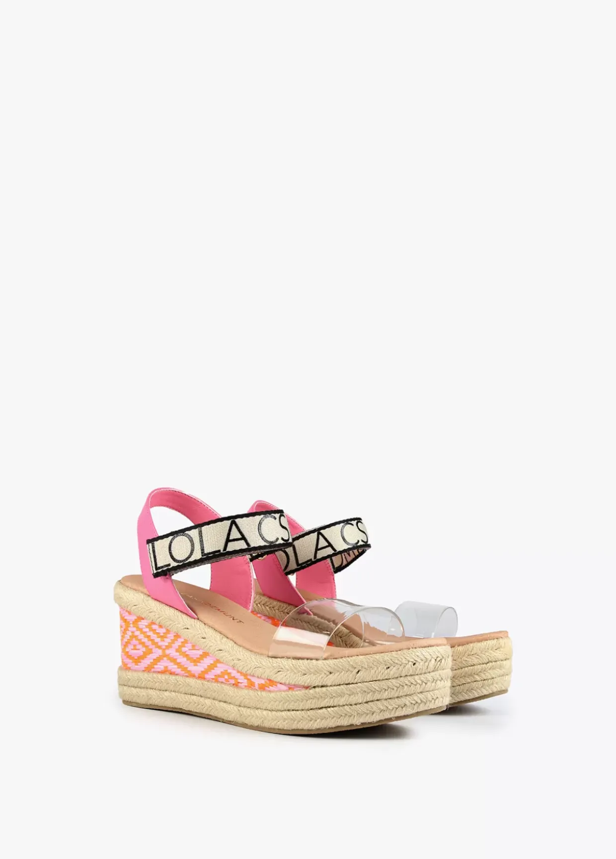 Sandalia tipo cuña en efecto ráfia y efecto piel combinados. Tira transparente en zona delantera y tira ajustable en zona tobillo. Plantilla logotipada.