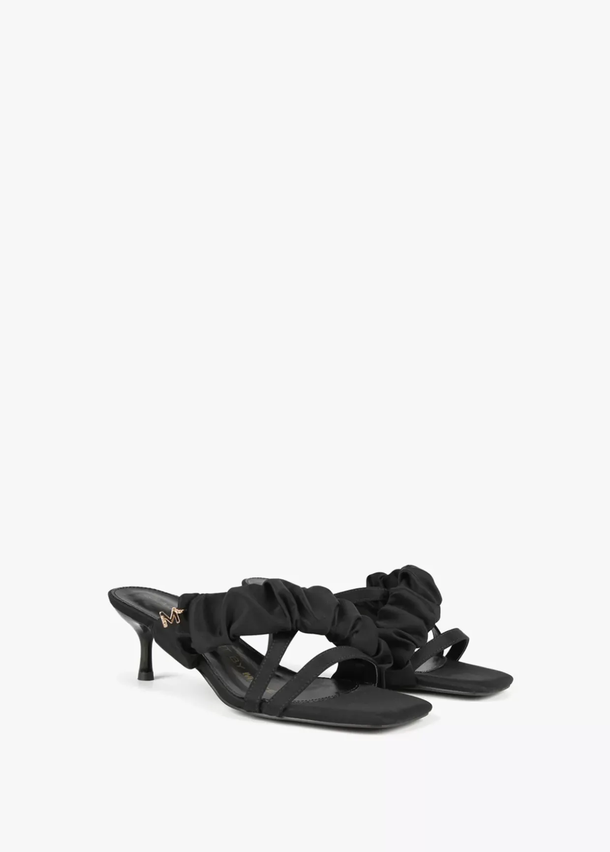 Sandalia de tacón medio con dos tiras y tira fruncida con detalle letra M dorada en su lateral. Plantilla logotipada.
