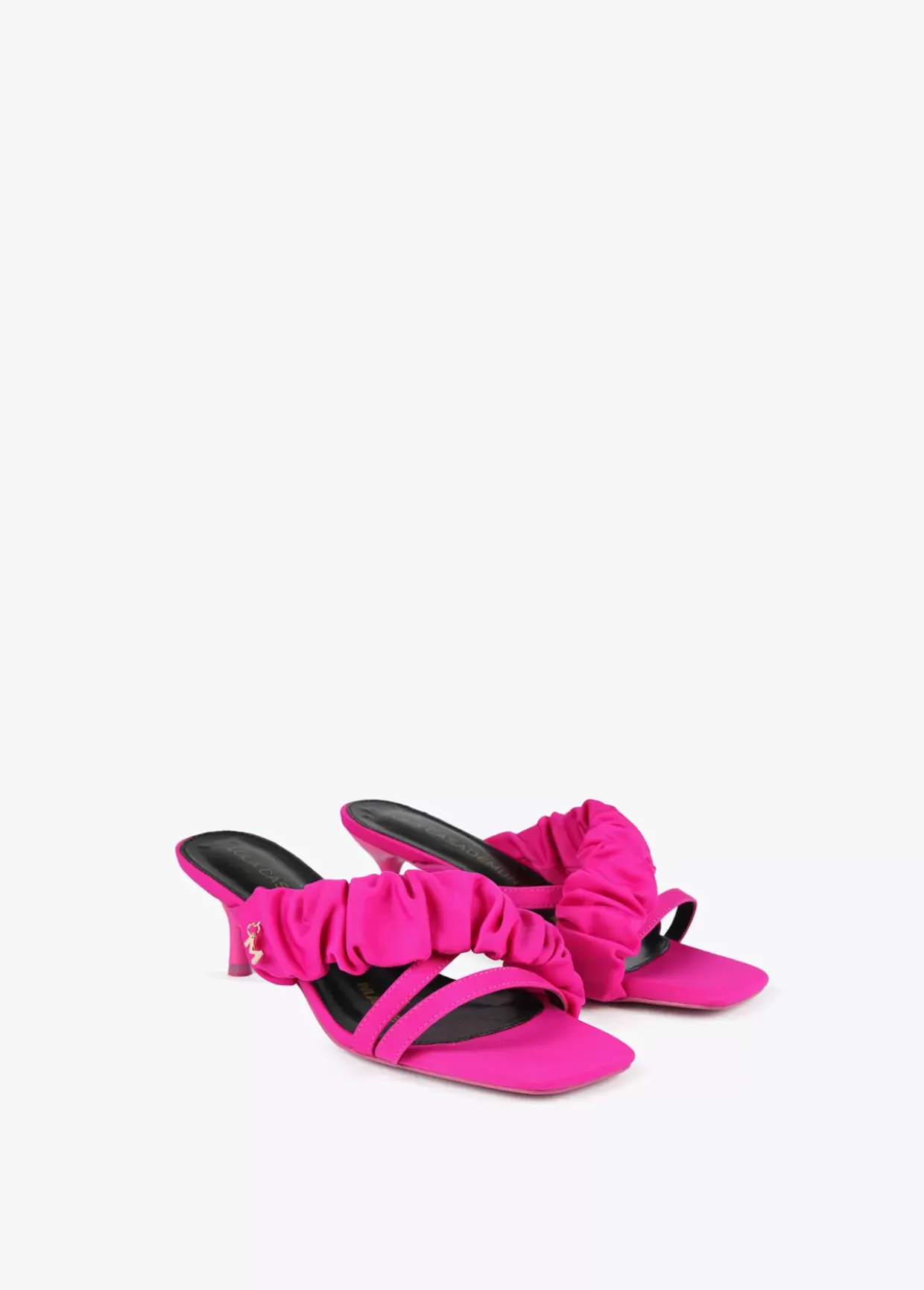 Sandalia de tacón medio con dos tiras y tira fruncida con detalle letra M dorada en su lateral. Plantilla logotipada.