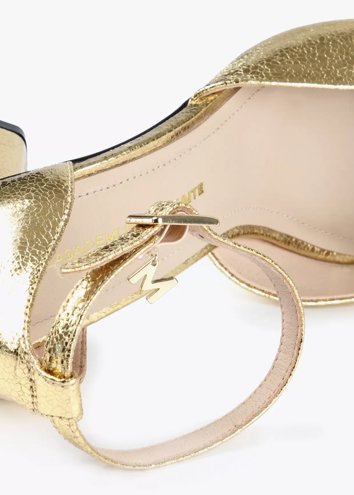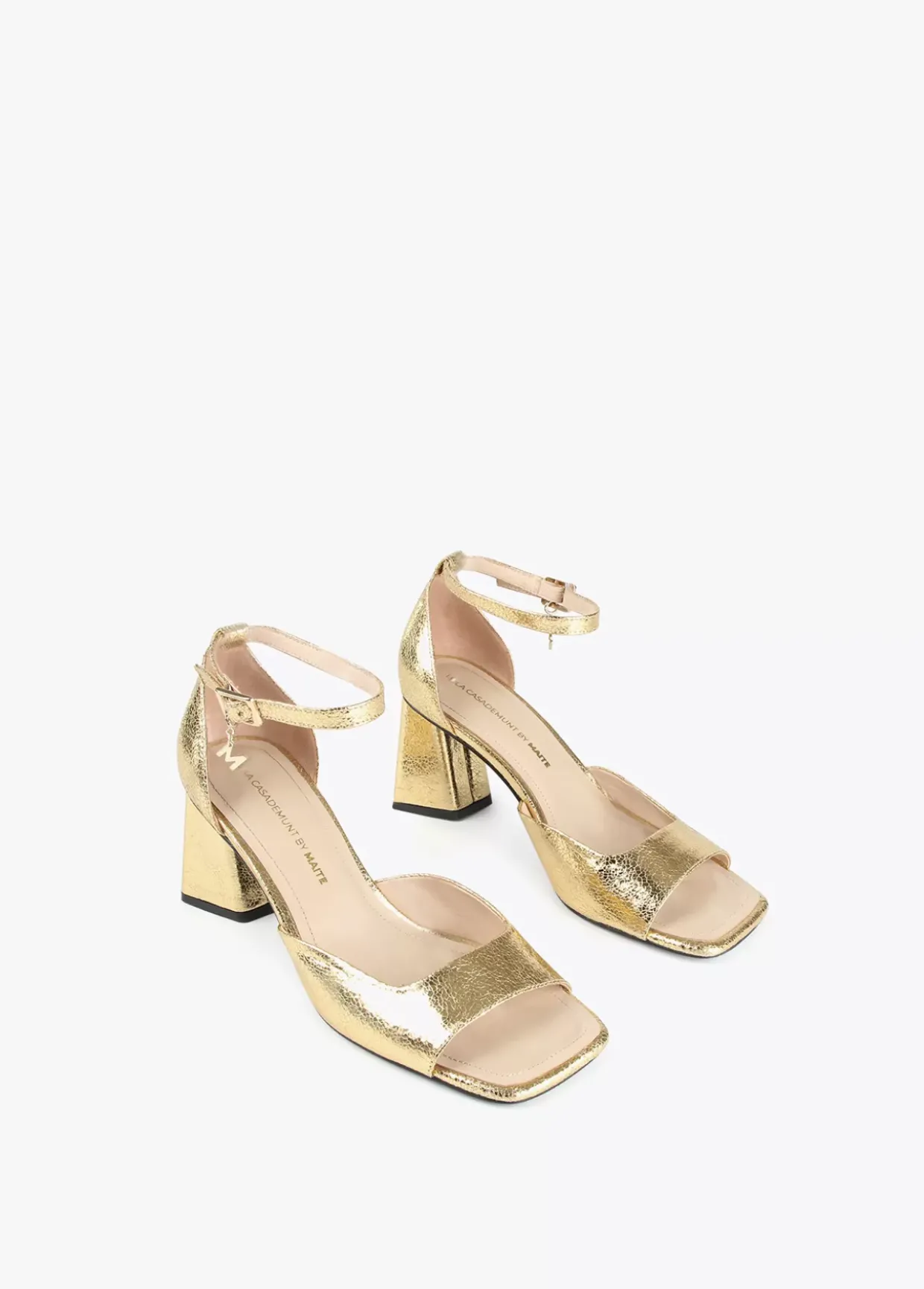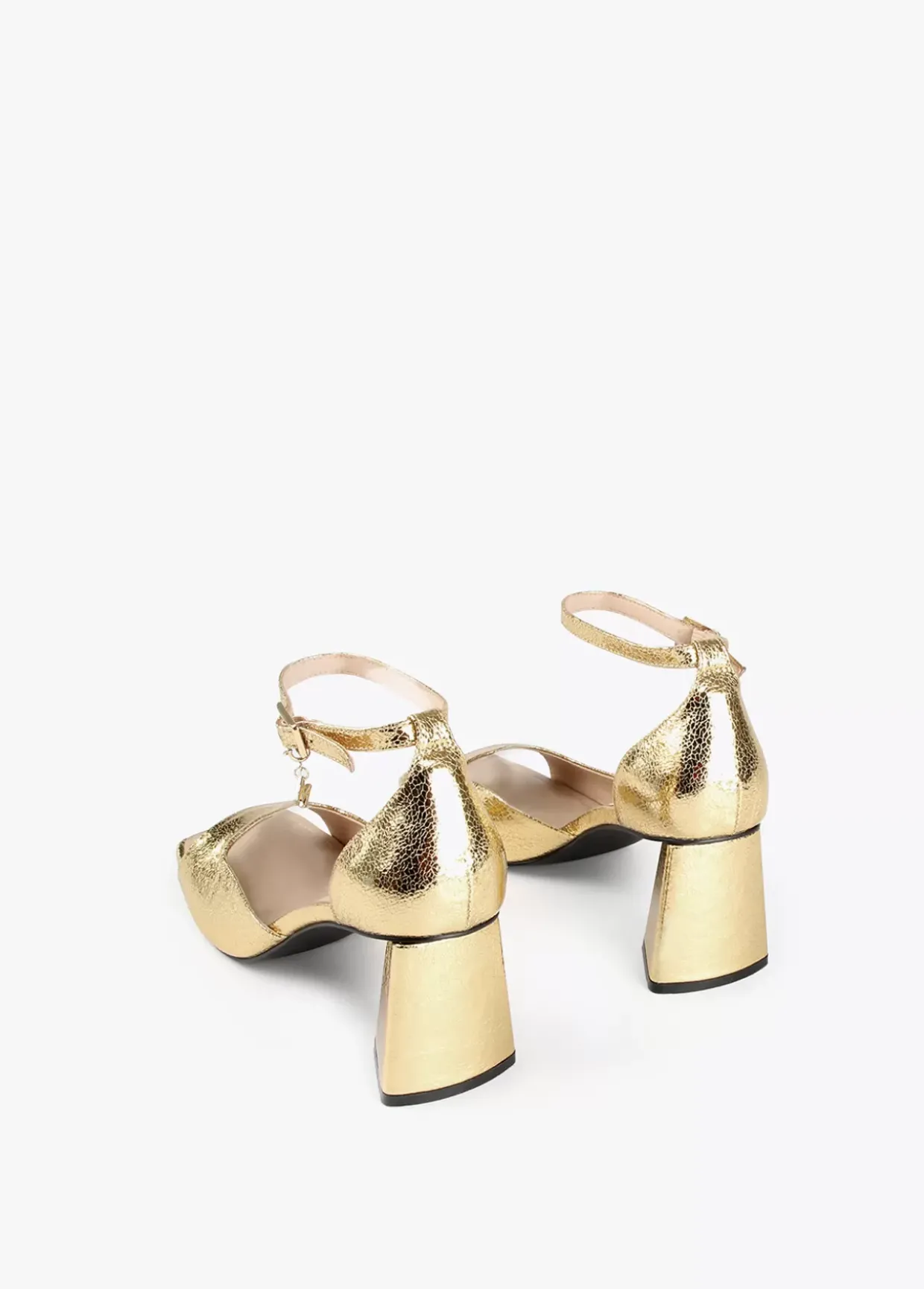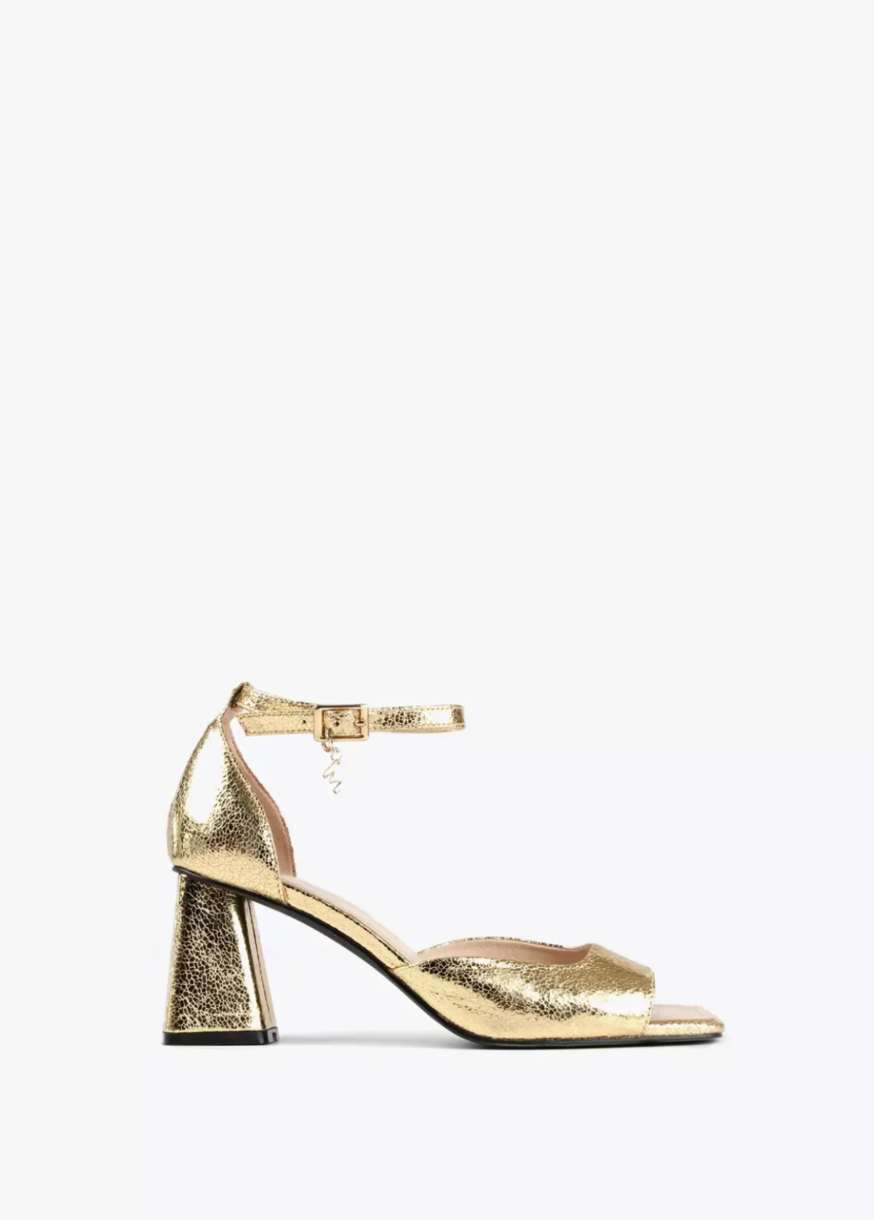 Sandalia dorada de tacón y escote cuadrado con cierre tobillero. Detalle medallita dorada en cierre. Plantilla logotipada.