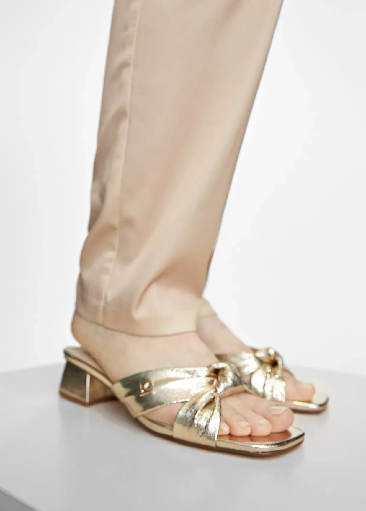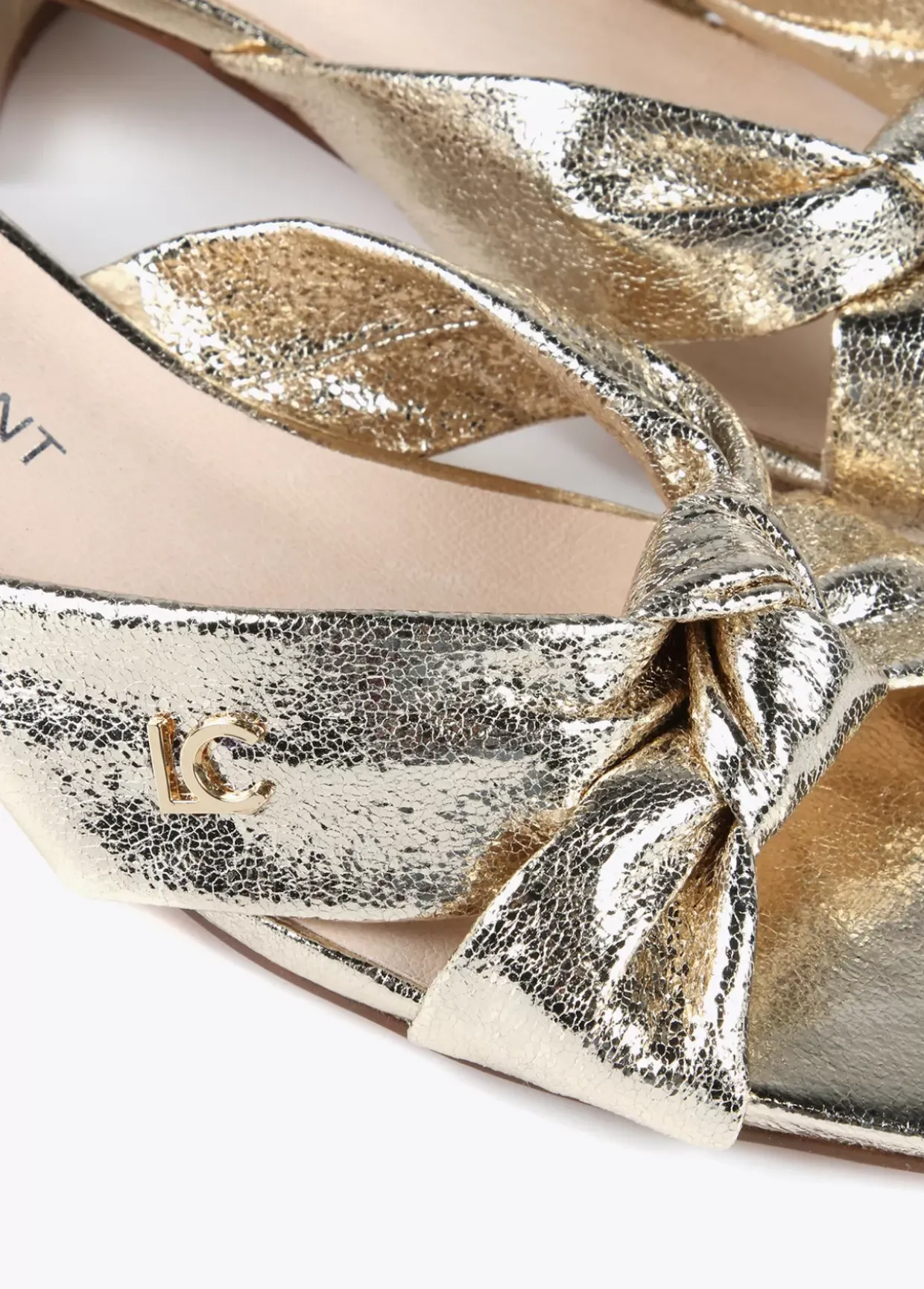 Sandalia con nudo metalizado y tacón medio. Plantilla logotipada y detalle letras logo al tono en lateral.
