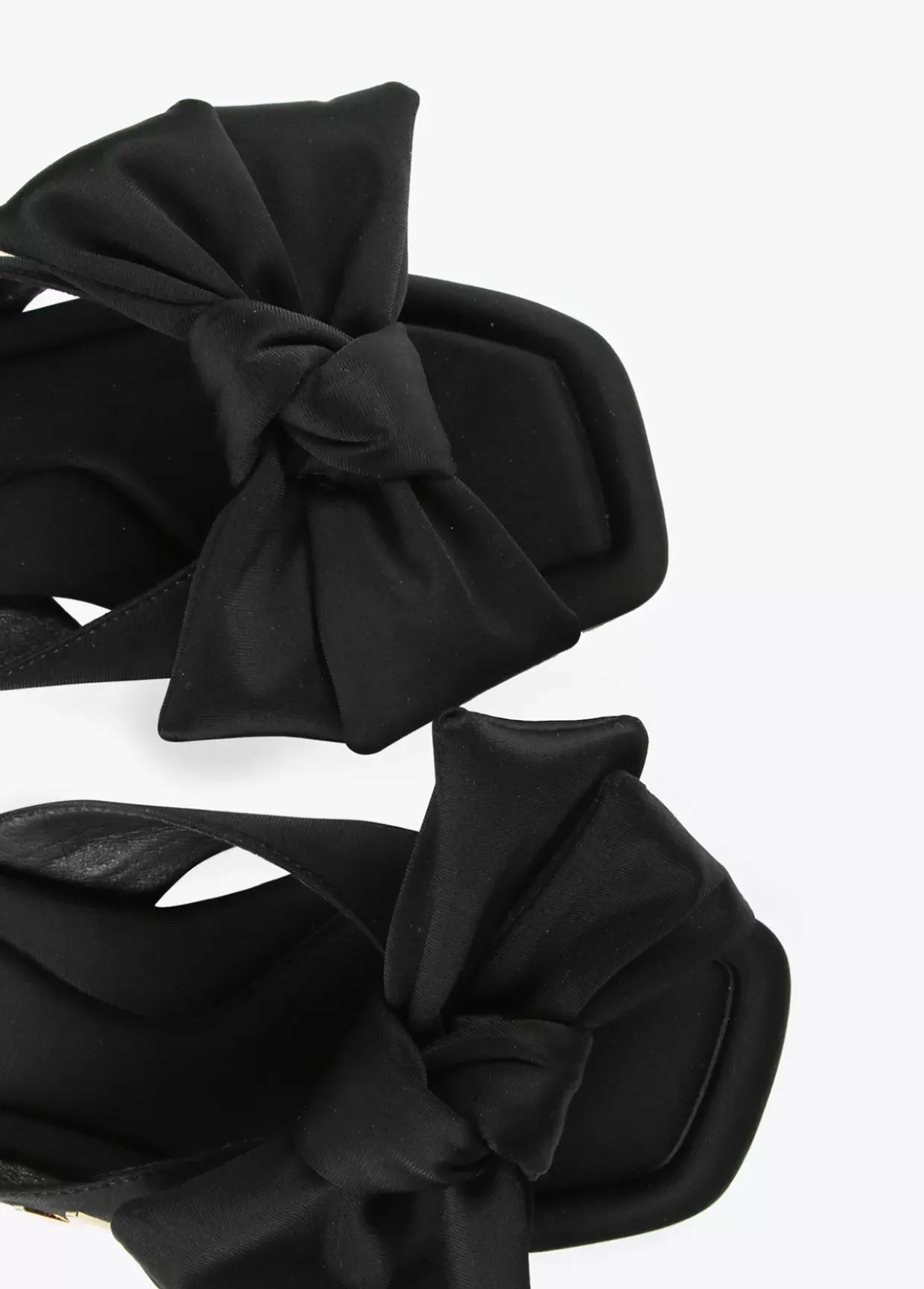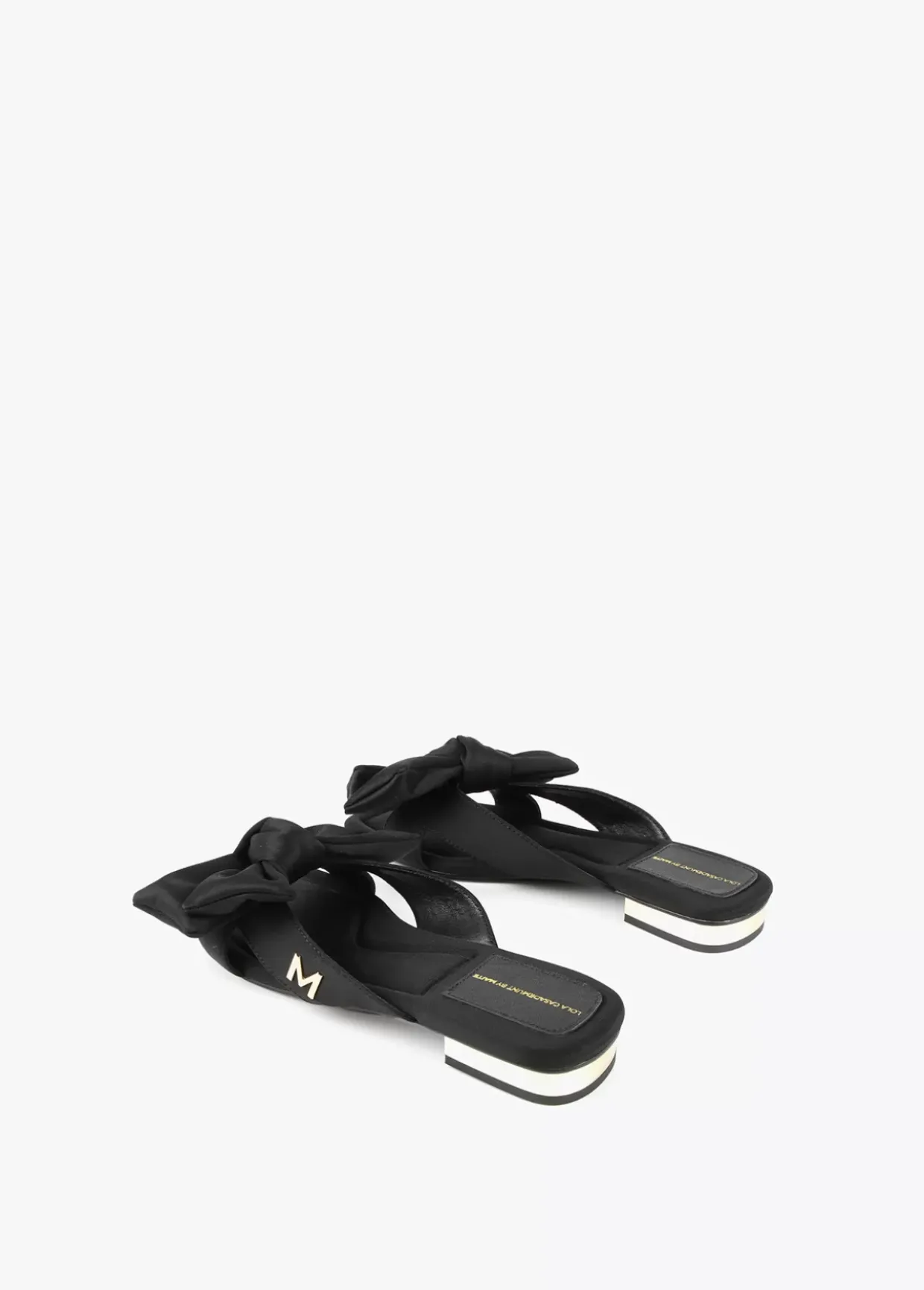 Sandalia plana con maxi lazo, tacón dorado, plantilla logotipada y detalle letra M dorada en lateral.