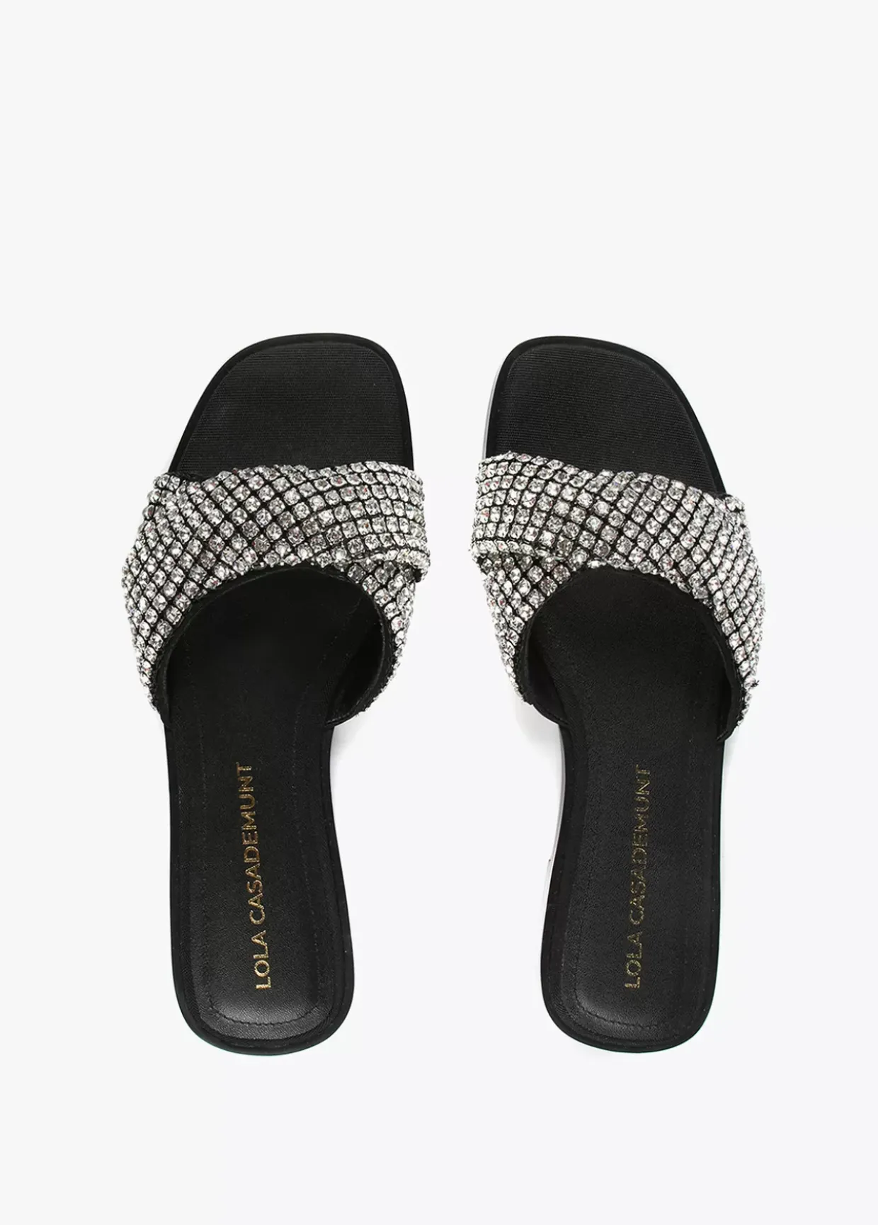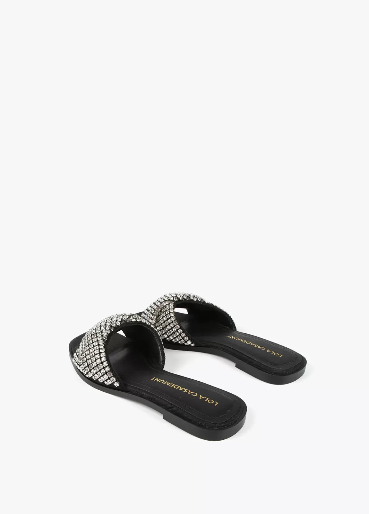 Sandalia plana con cristales en zona empeine. Suela y plantilla en color negro logotipada.
