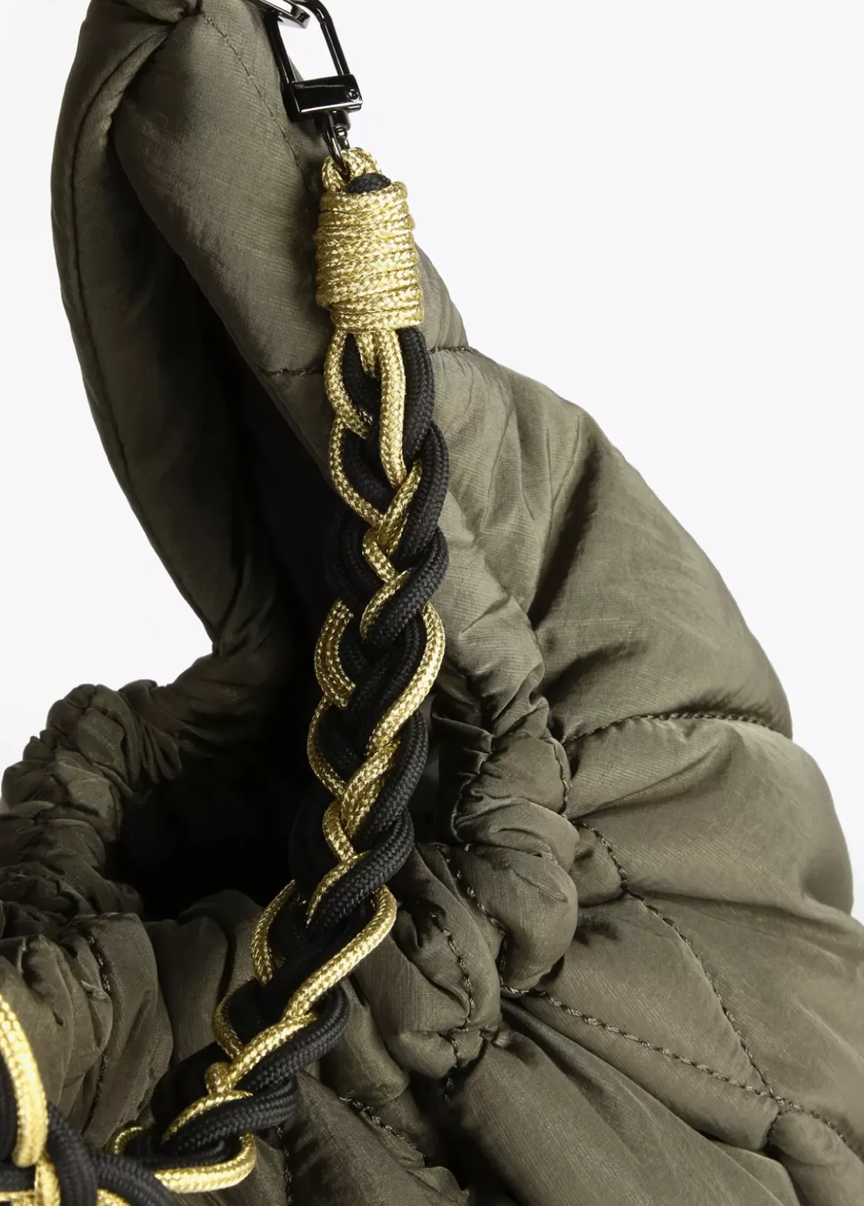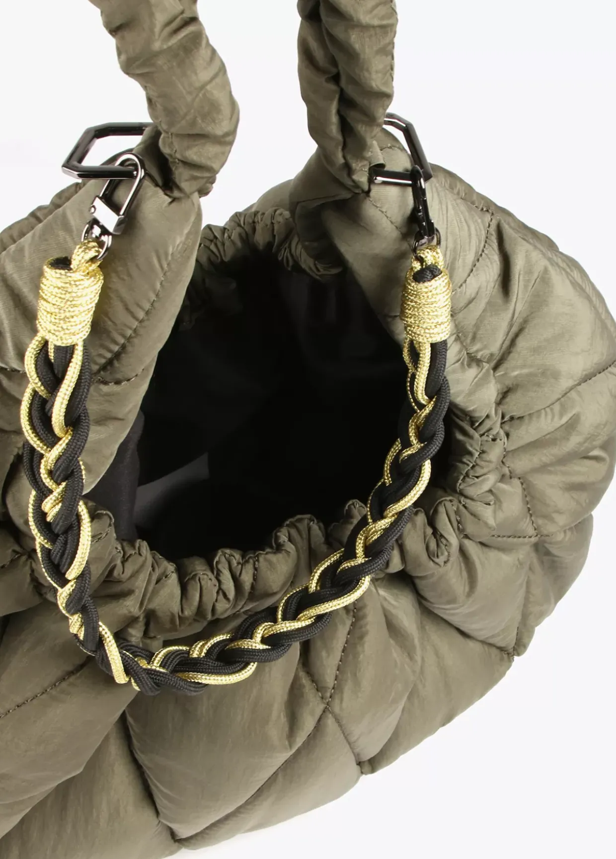 Bolso tipo shopper acolchado con asa trenzada de cordones extraíble. Cierre con botón imantado y logo dorado en parte frontal.