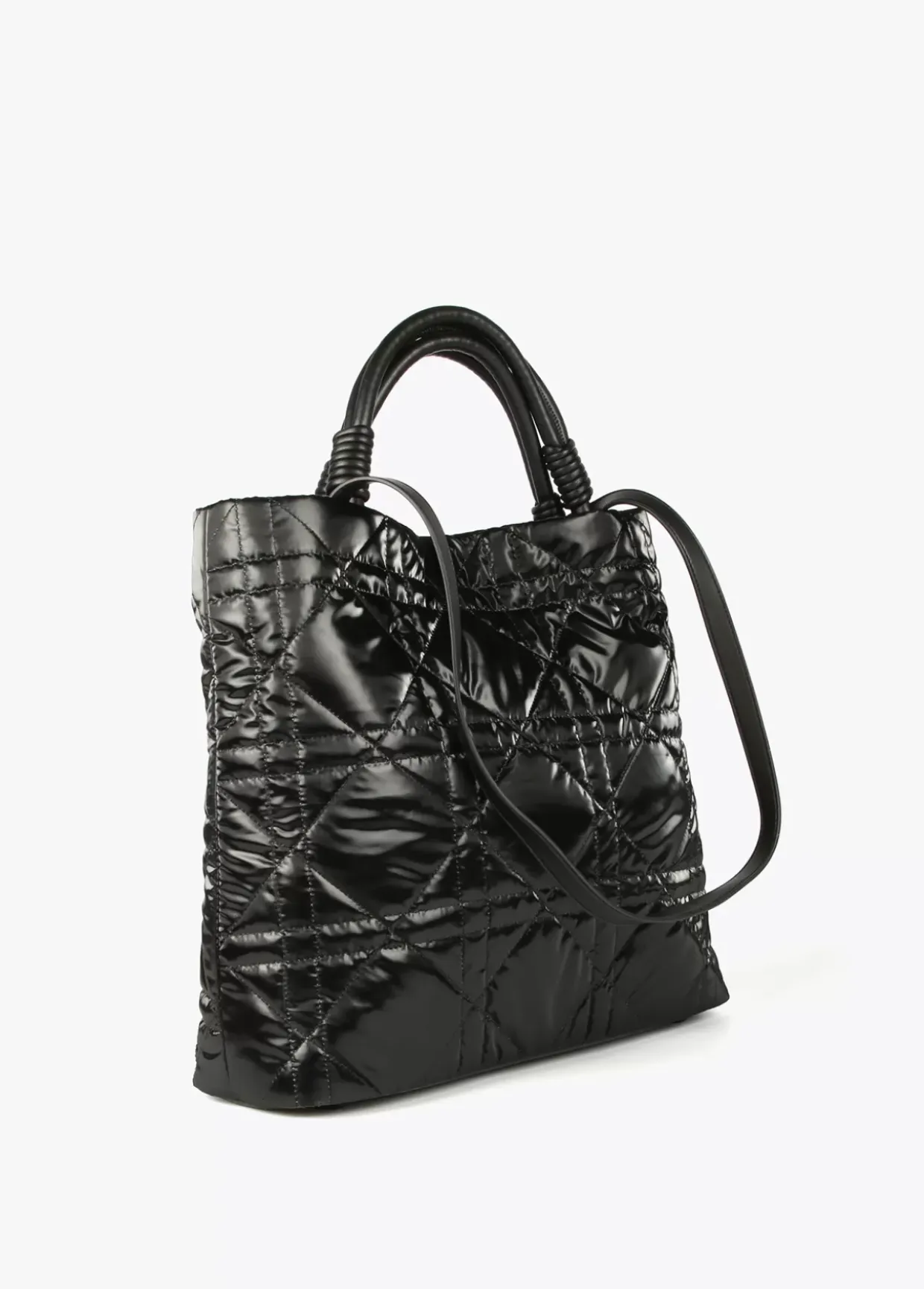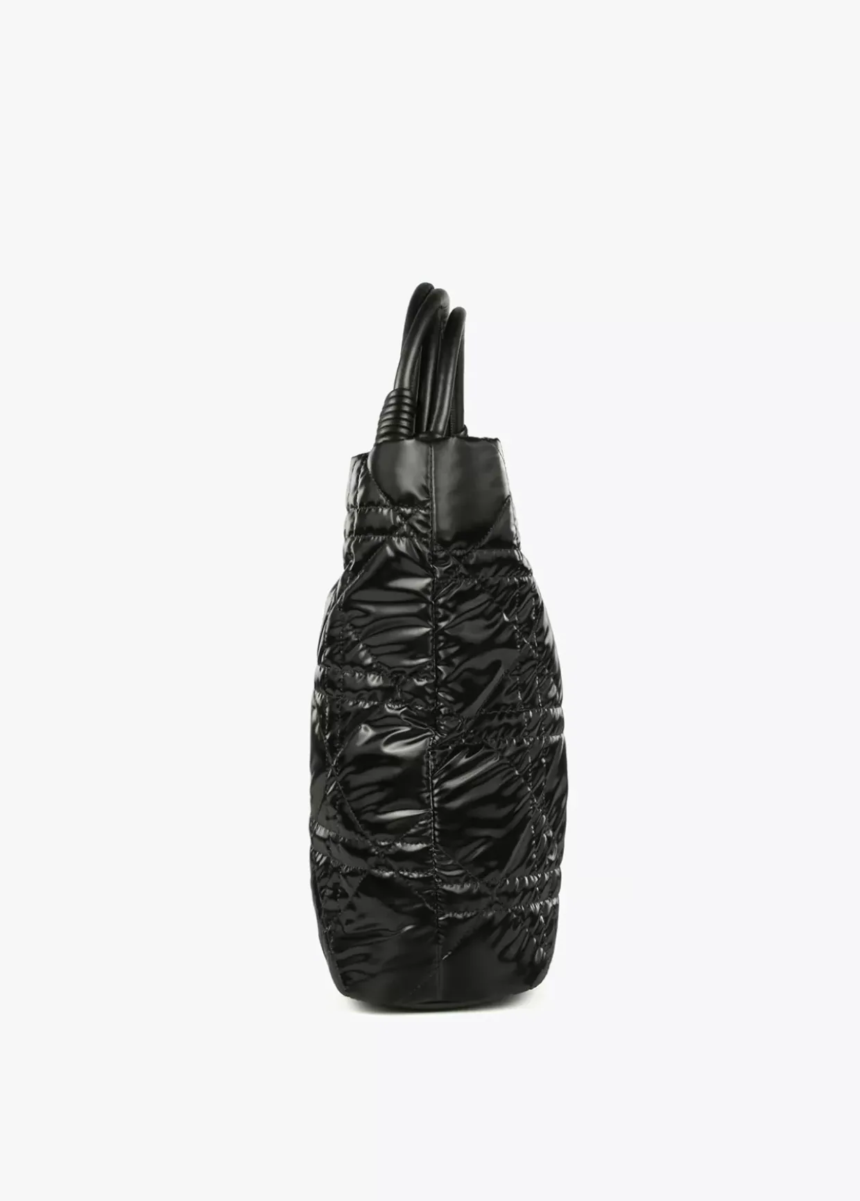 Bolso tipo shopper acolchado de nylon en efecto brillante y logo en parte frontal. Asas de hombro y asa bandolera y bolsito neceser interior con cremallera.