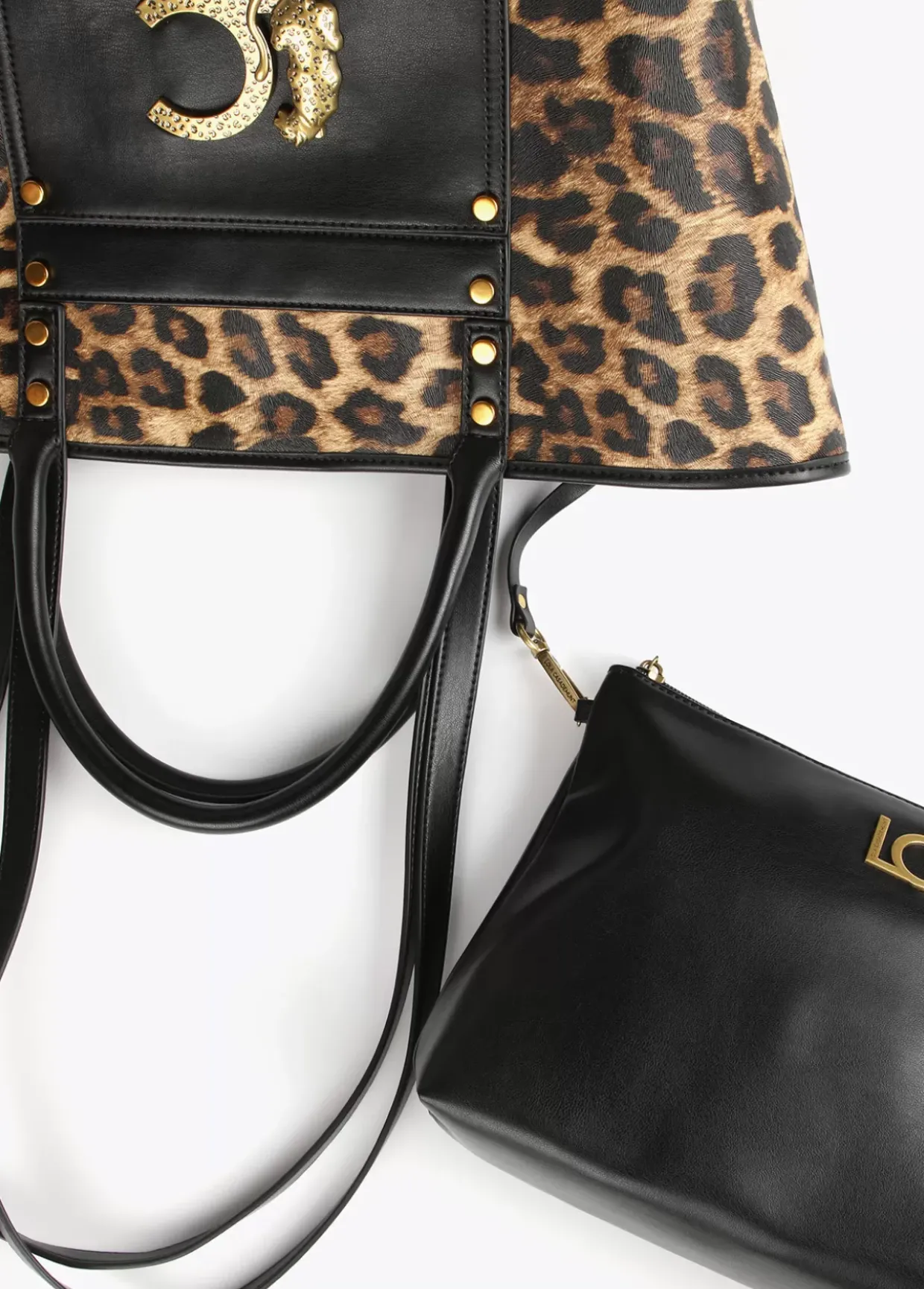 Bolso tipo shopper en efecto piel y animal print. Logo animal dorado en parte frontal. Asas de hombro y asas de mano y bolsito neceser interior con cremallera.