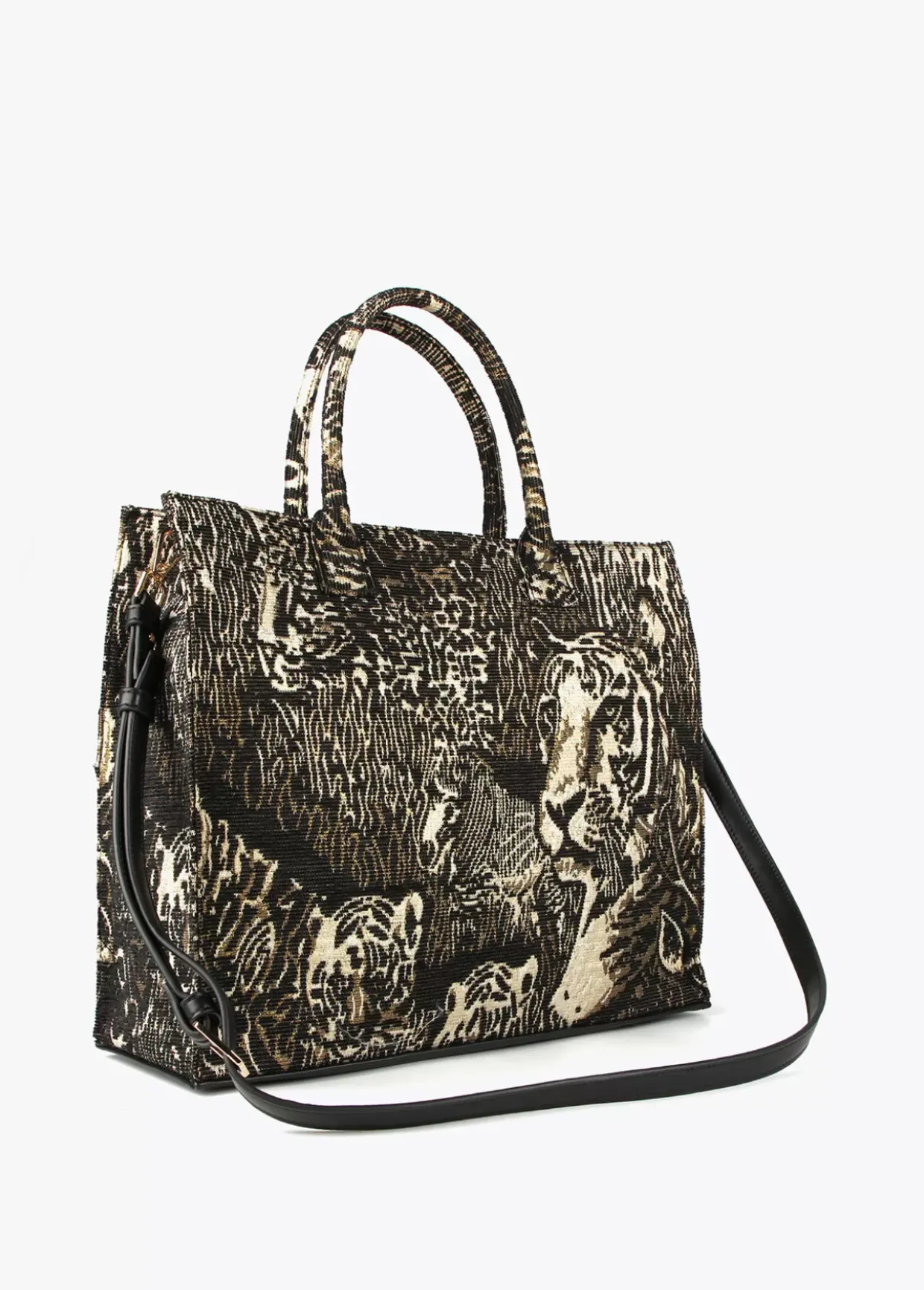 Bolso tipo shopper en tejido jacquard con motivo animal y logo en parte frontal. Asas de mano y asa bandolera ajustable y extraíble. Cierre con cremallera.