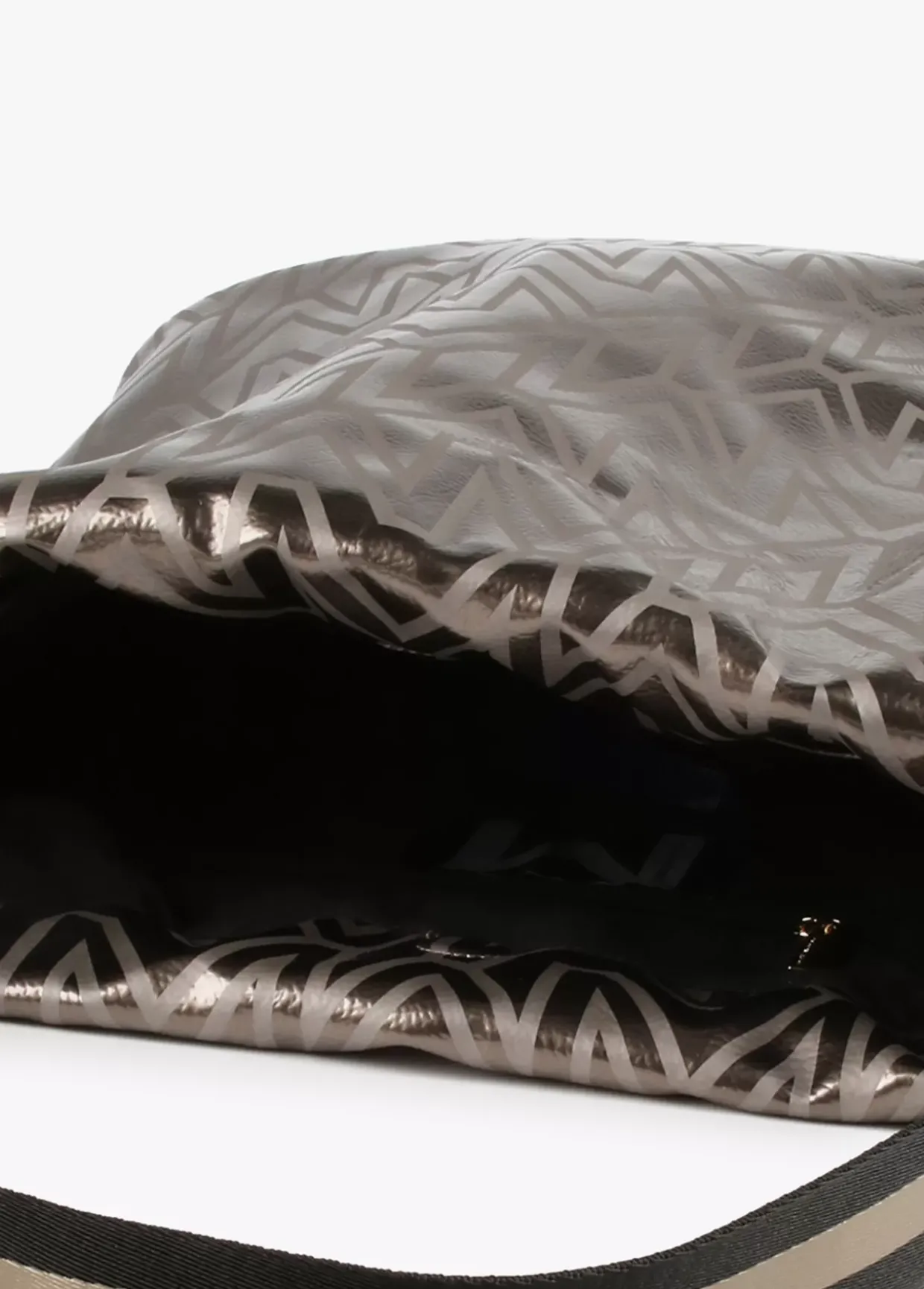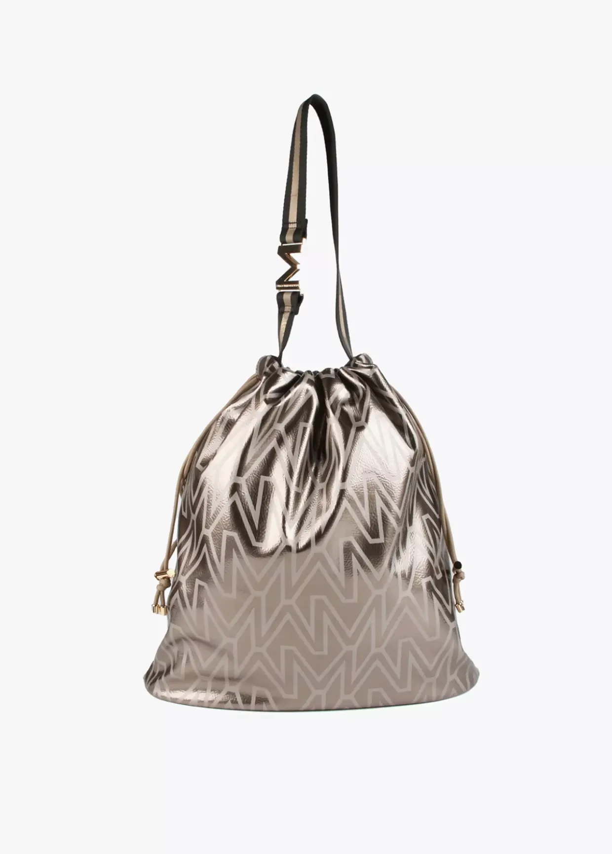 Bolso shopper tipo saco con estampado monograma. Asa con letra logo dorada y cierre con cordón ajustable.