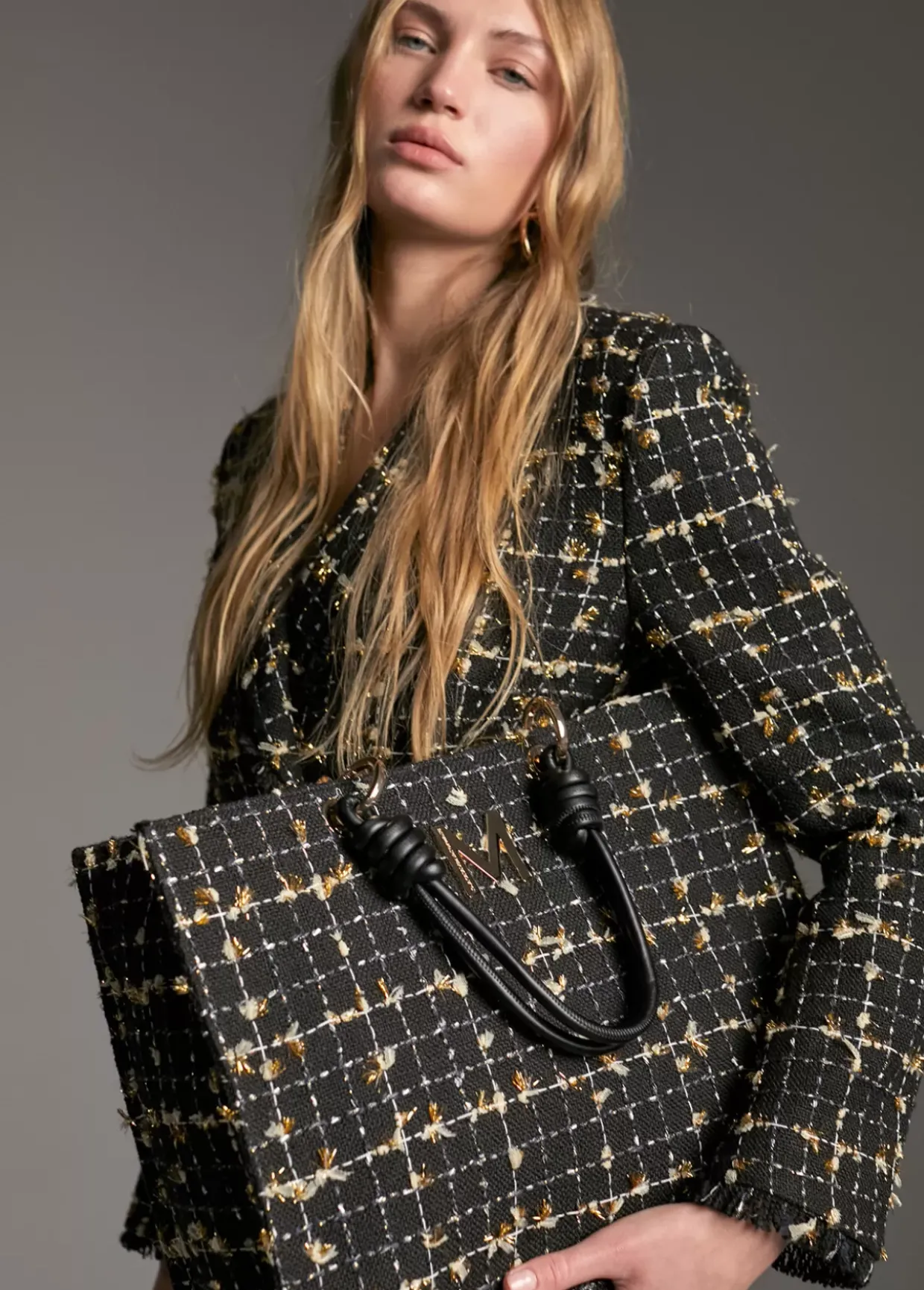 Bolso tipo shopper en tweed color negro combinado con color dorado. Asas de mano y hombro en efecto piel, cierre con botón imantado en lengüeta y letra logo dorada en parte frontal.