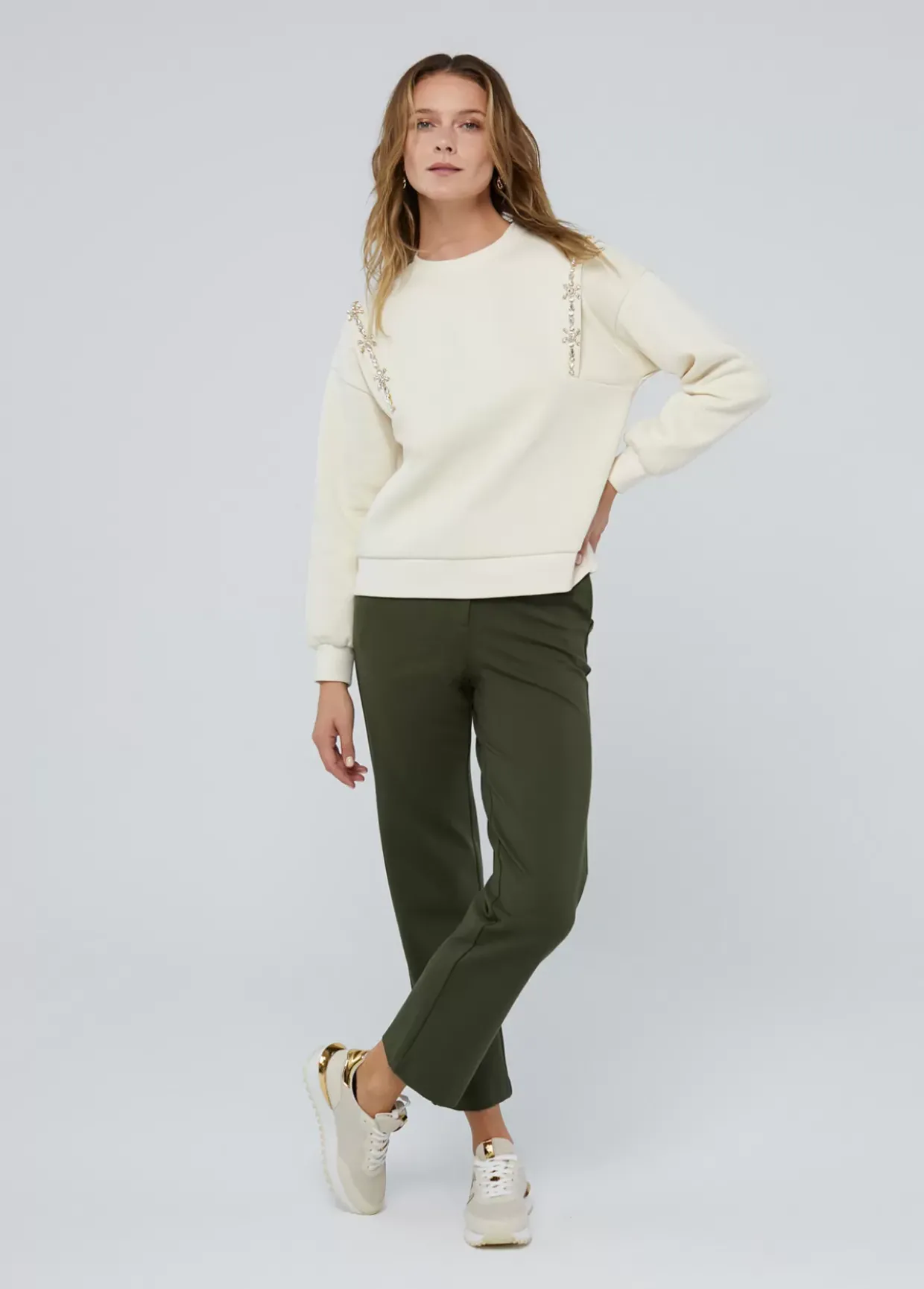Sudadera con detalle de pedrería a tono. Cuello caja y manga caída.