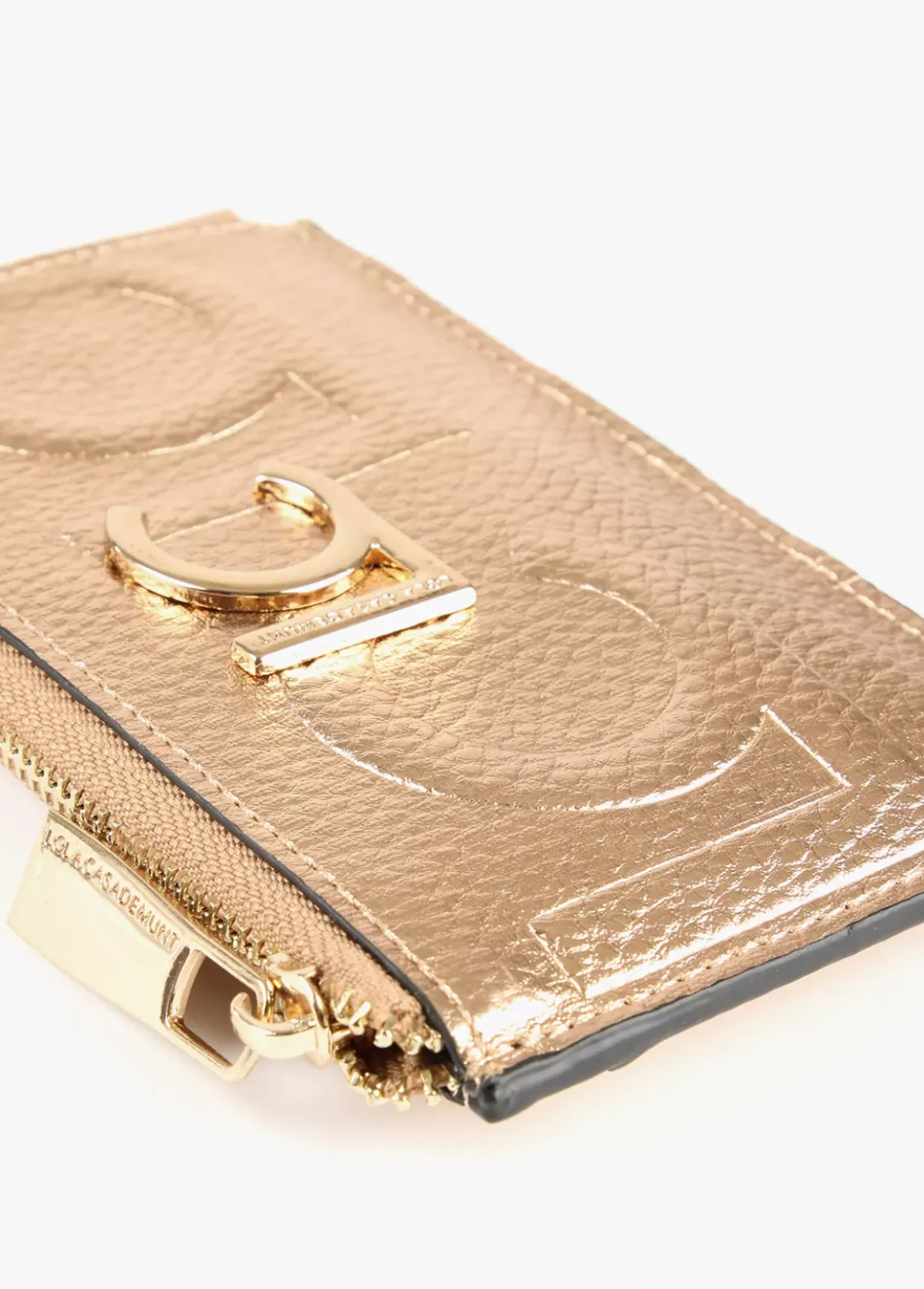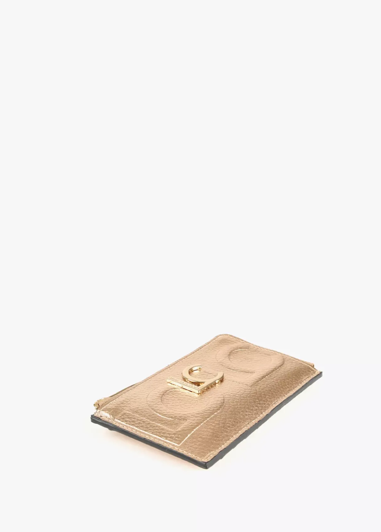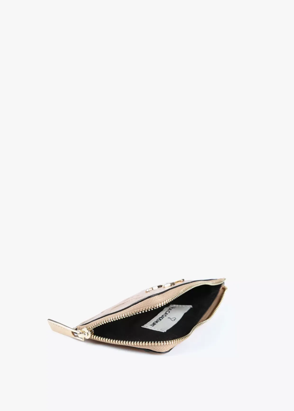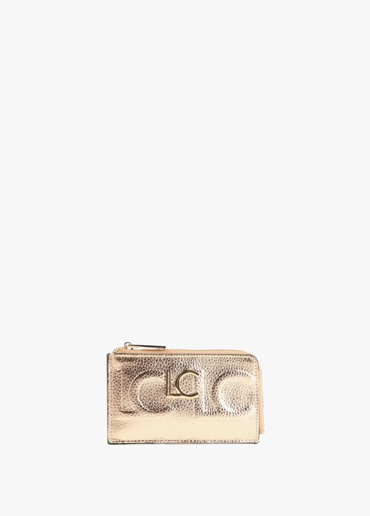 Tarjetero en efecto piel metalizado y logo grabado. Logo metalizado en parte frontal. Bolsillo con cierre de cremallera.