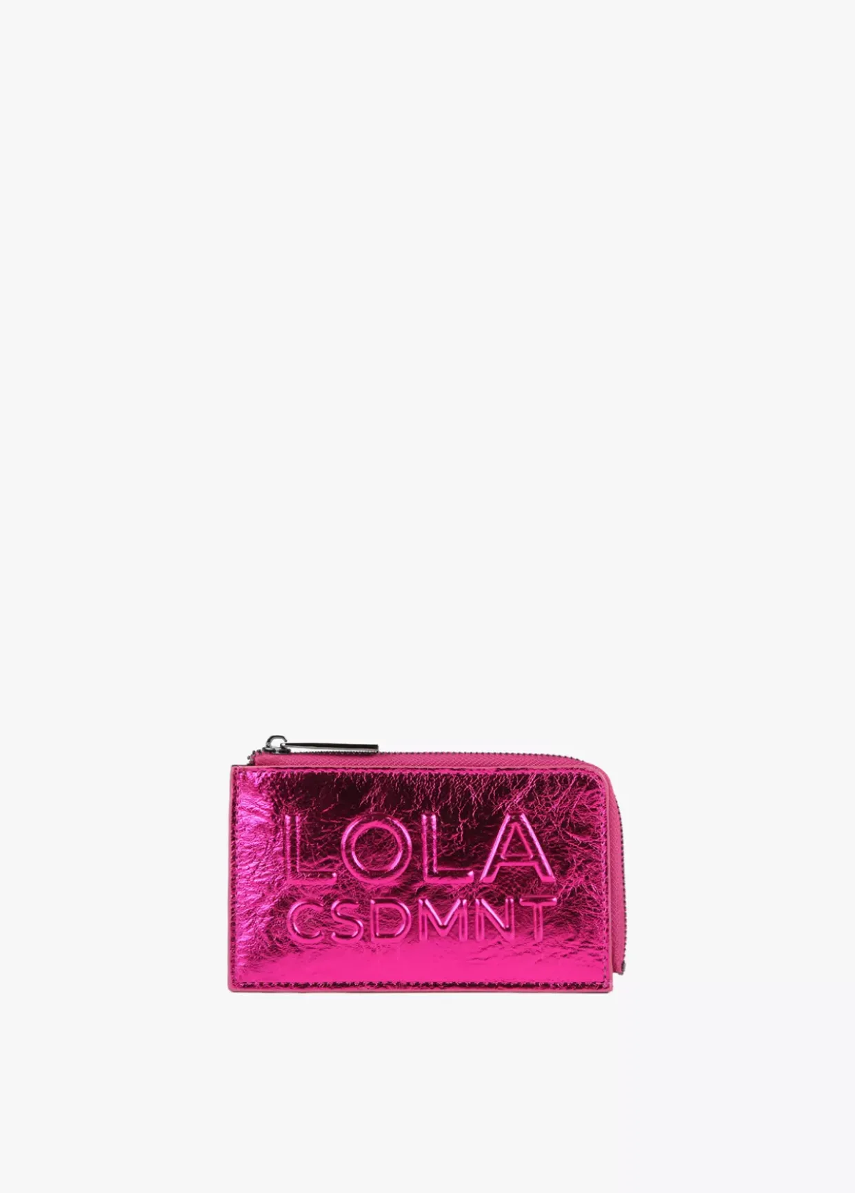 Tarjetero metalizado. Cierre con cremallera para monedas y logo grabado en parte frontal.