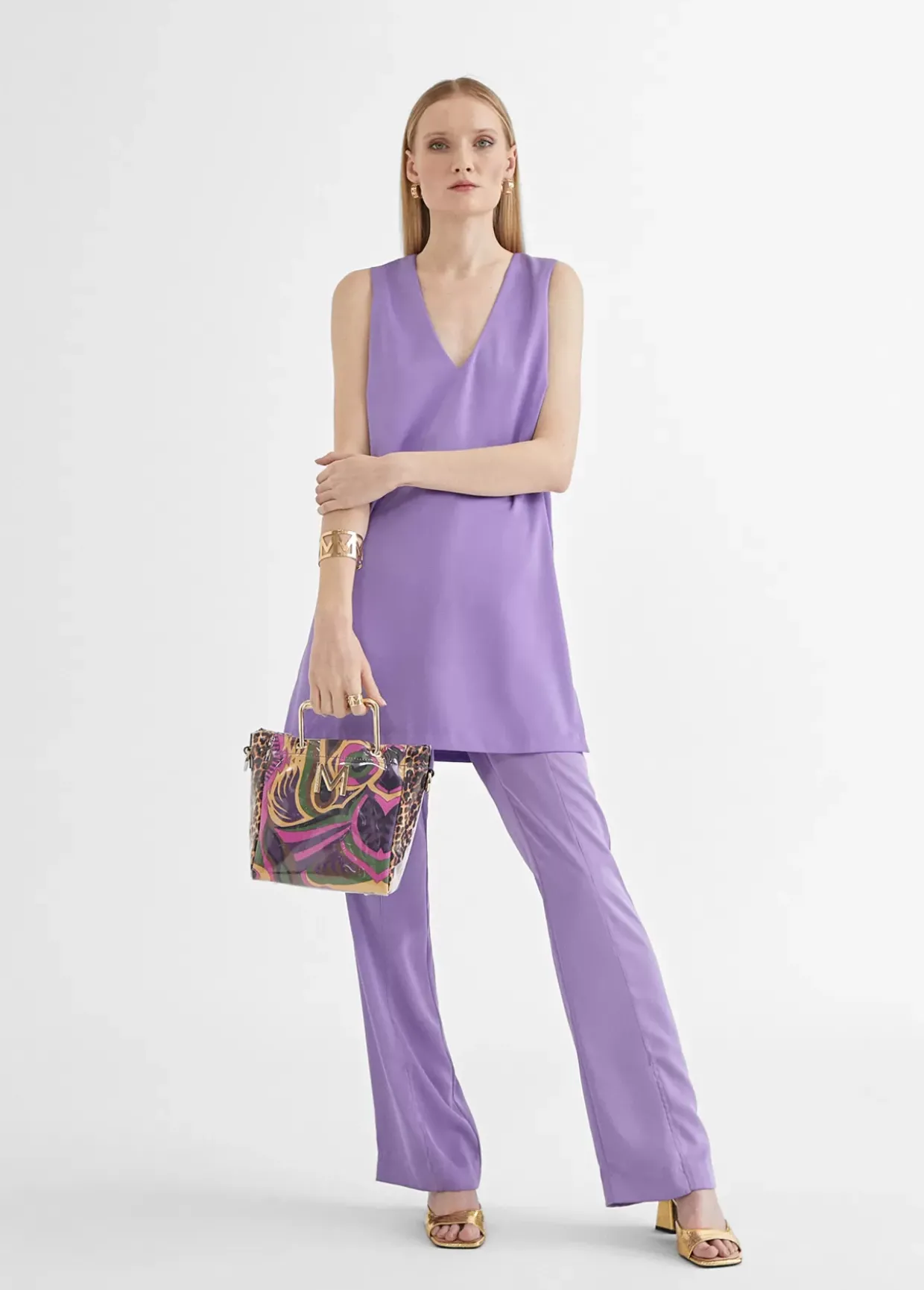Top largo de tirantes anchos. Escote pico y aberturas laterales.