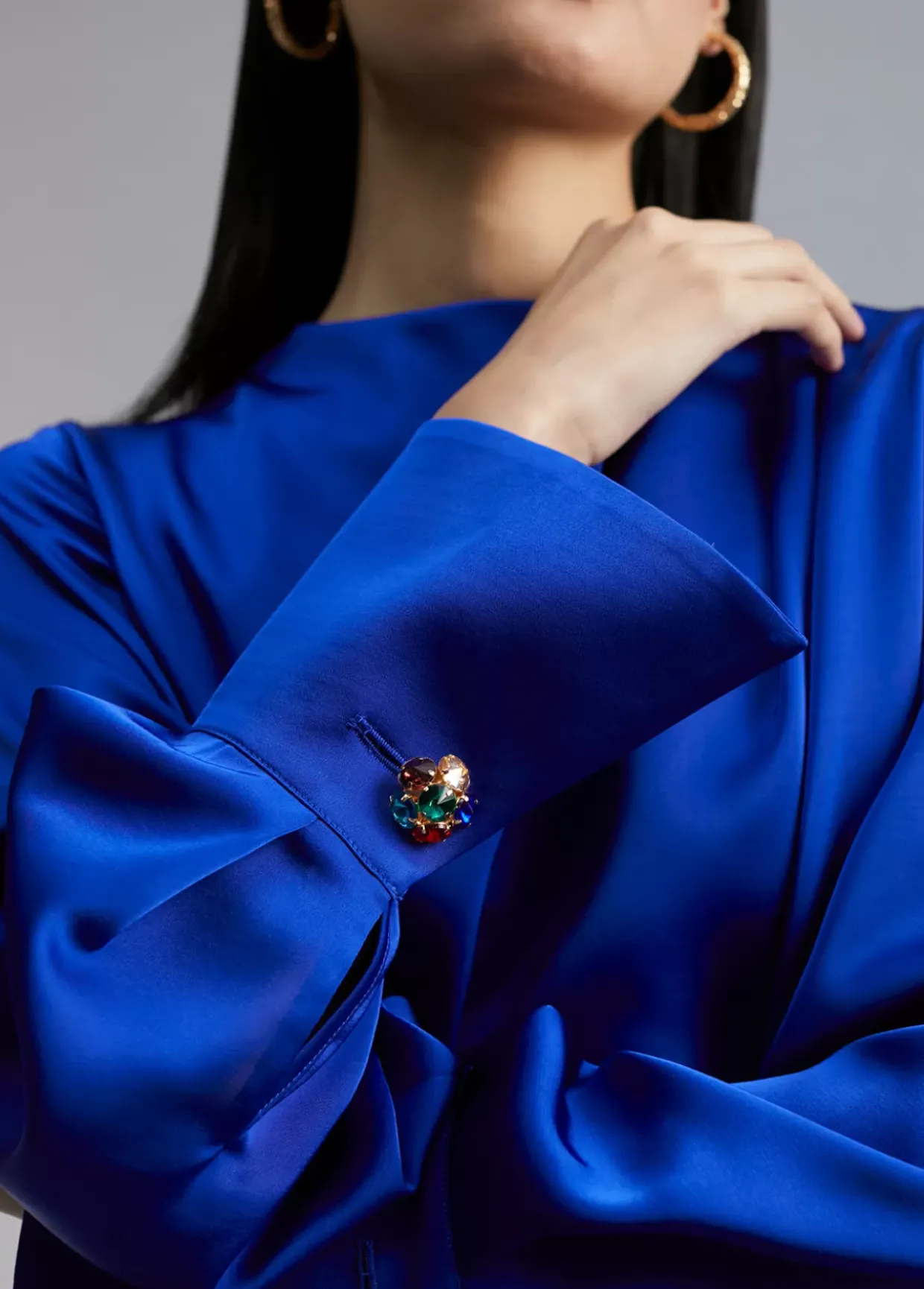 Vestido corto satinado de cuello caja y manga larga. Puños camiseros con detalle botón joya. Cinturón del mismo tejido y color.