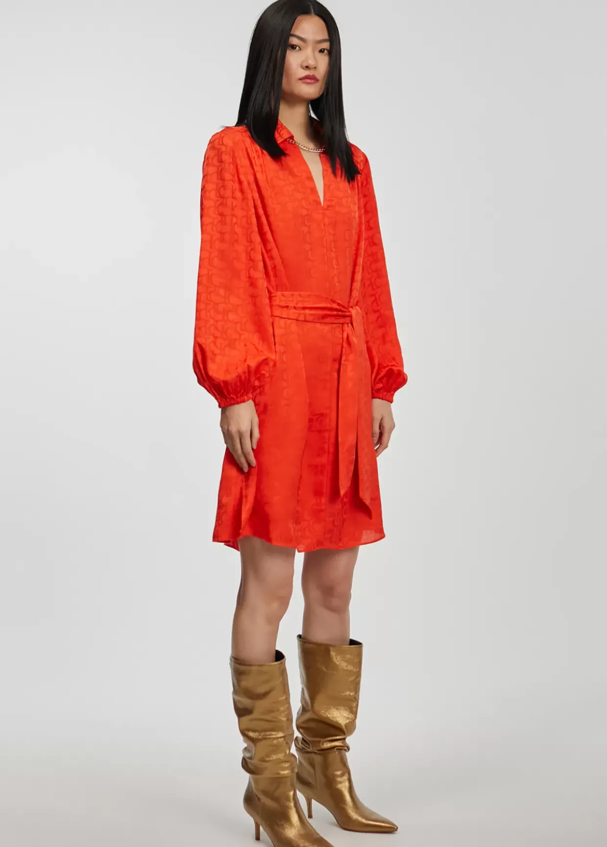 Vestido corto con tejido logotipado a tono. Cuello pico, bolsillos laterales y lazada en cintura. Puños camiseros con botón dorado.