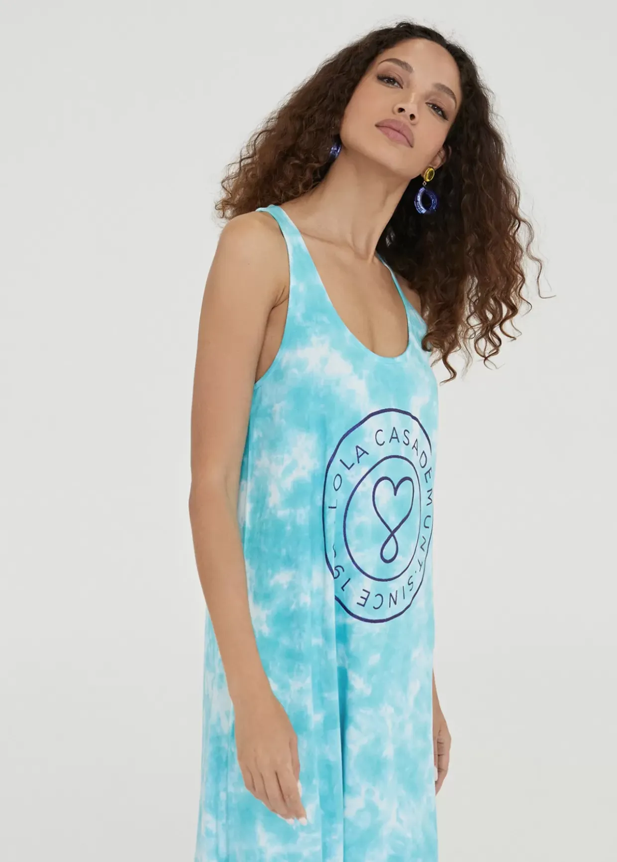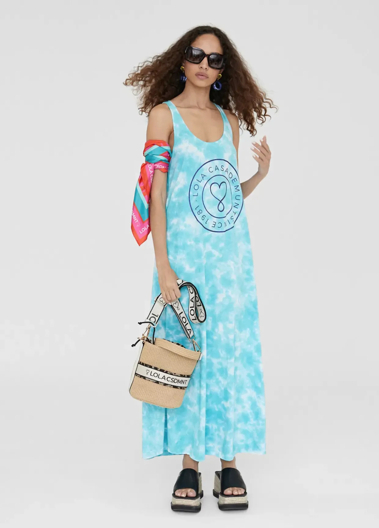Vestido largo en estampado tie dye. Escote redondeado y tirantes. Logo posicionadao en frontal a contraste. Aberturas laterales en bajo.