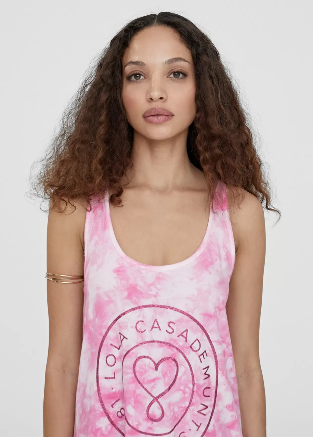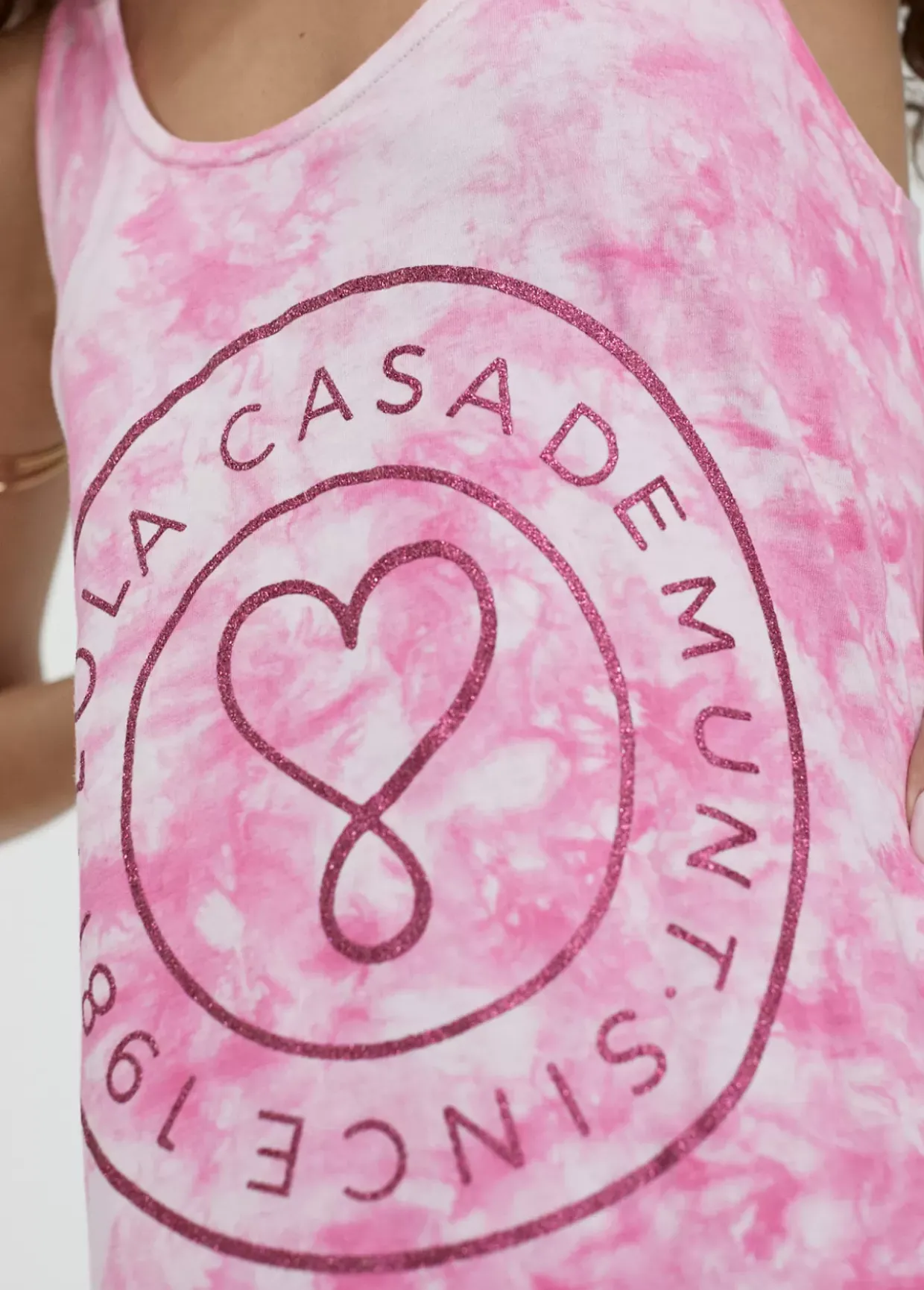 Vestido largo en estampado tie dye. Escote redondeado y tirantes. Logo posicionadao en frontal a contraste. Aberturas laterales en bajo.