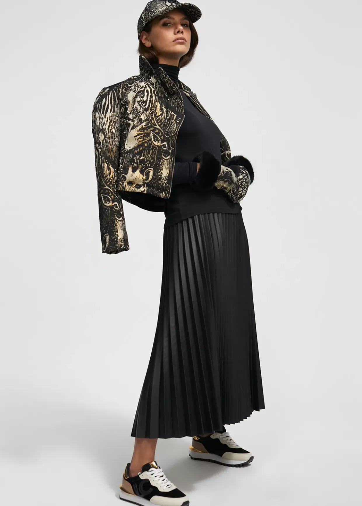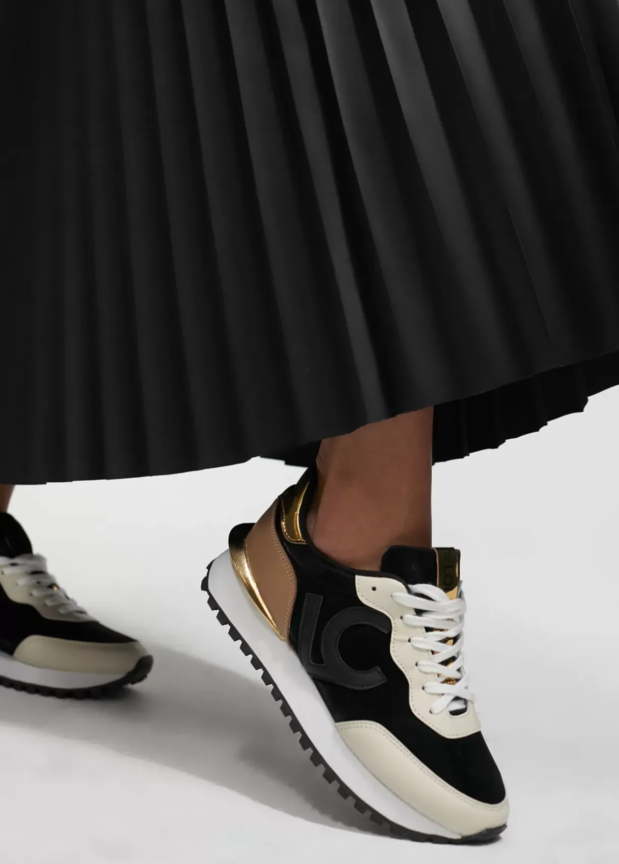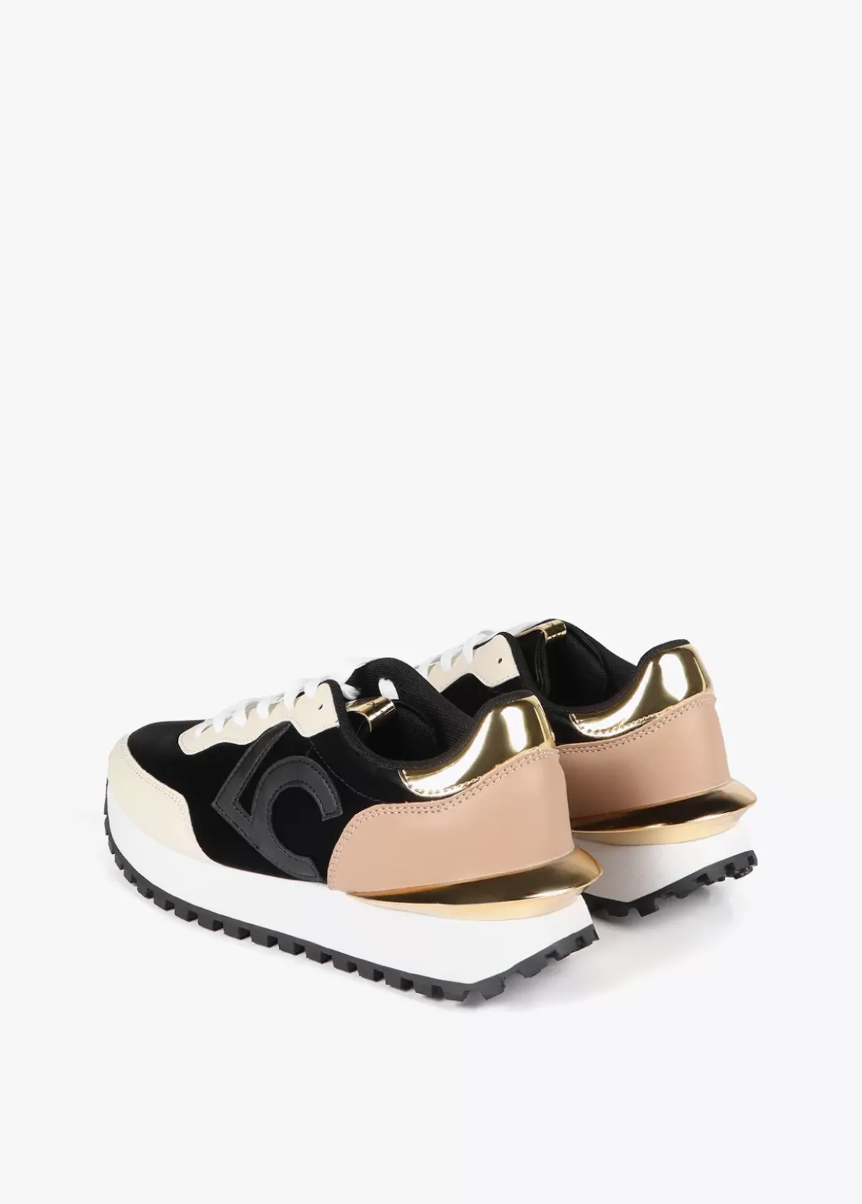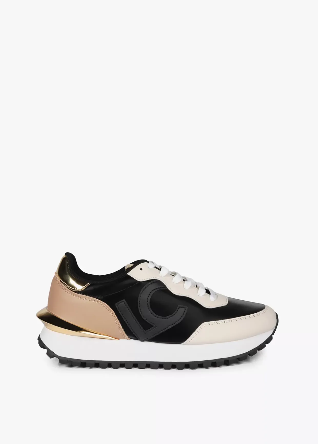 Zapatillas deportivas tipo sneakers con detalles dorados combinados. Logo en lengüeta y plantilla y maxi letras logo en el lateral. Cordones en color negro y en color blanco.