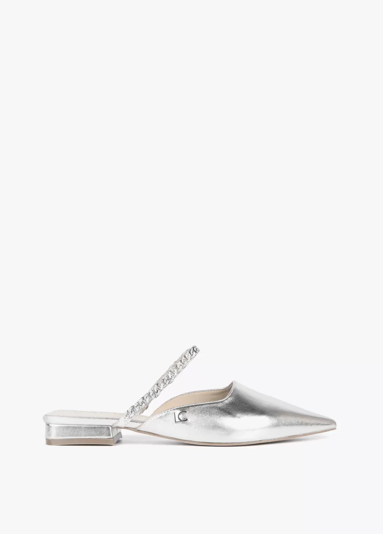 Zapato plano destalonado con punta y tira de pedrería en zona empeine. Suela logotipada y letras logo en laterales.