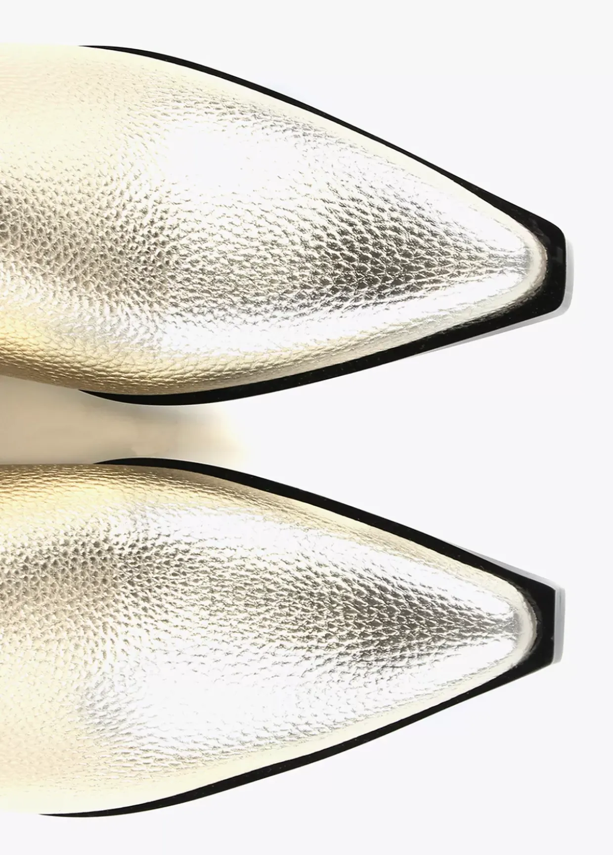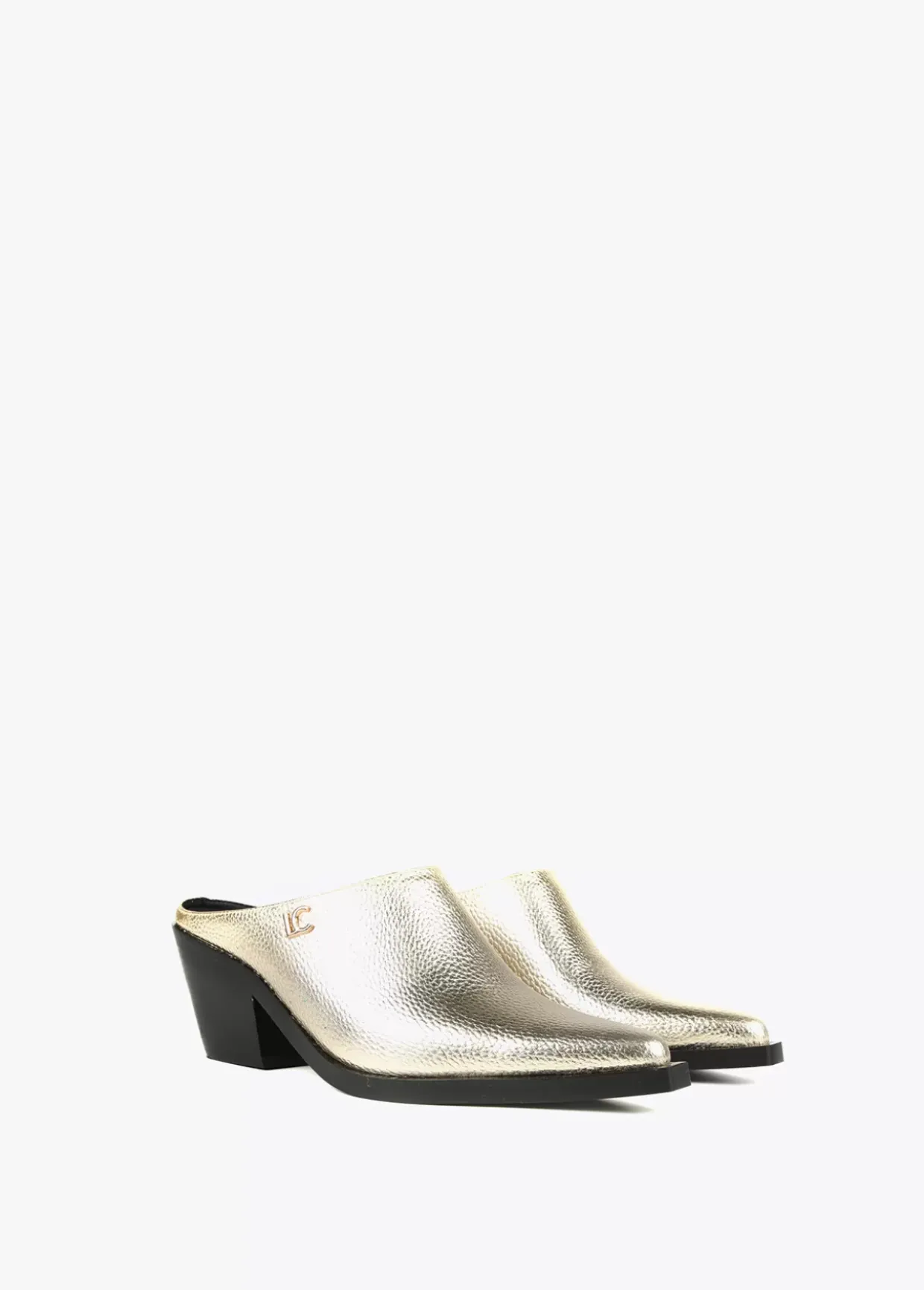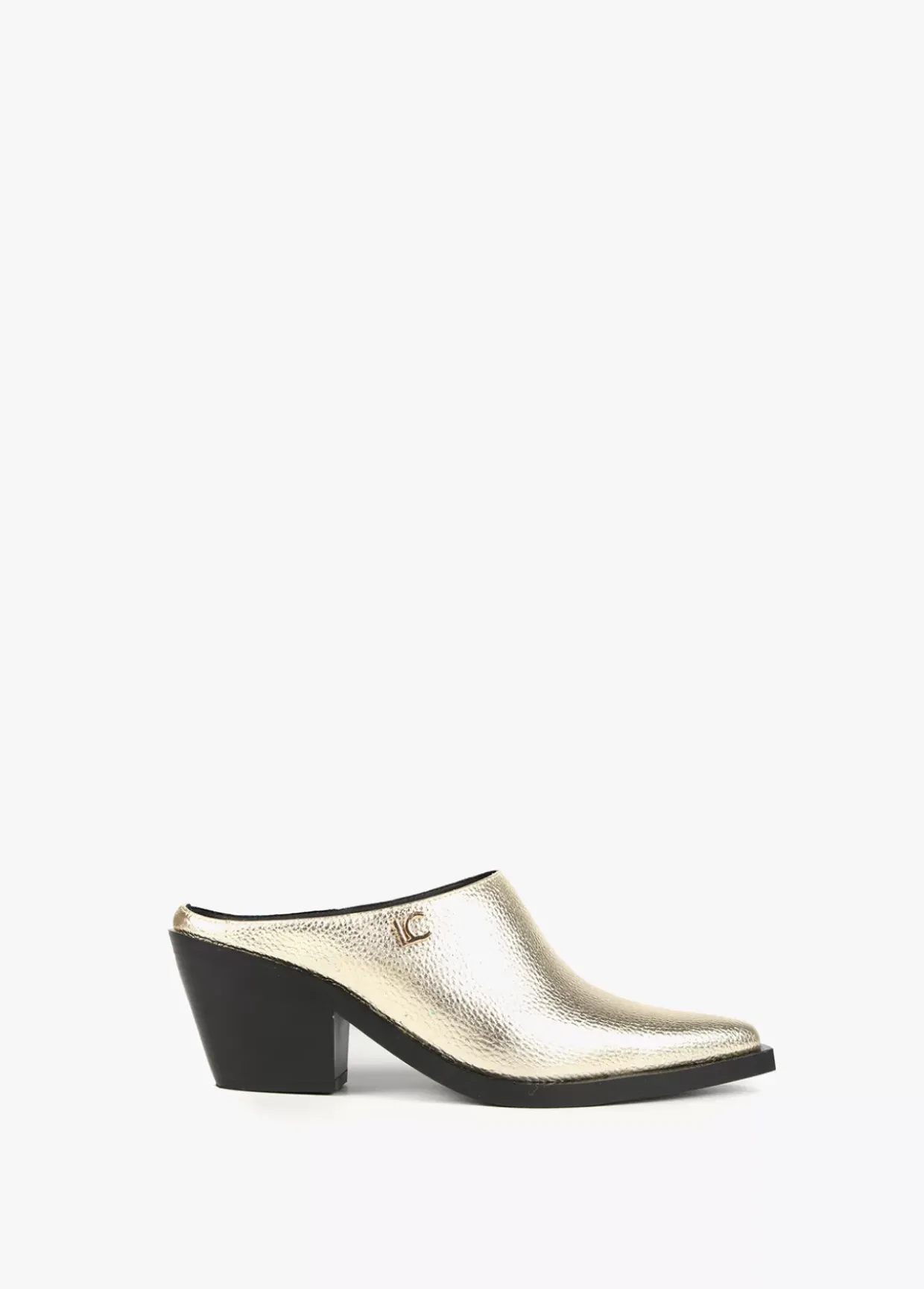 Zueco dorado con punta estilo cowboy. Letra logotipo dorada en lateral. Plantilla logotipada.