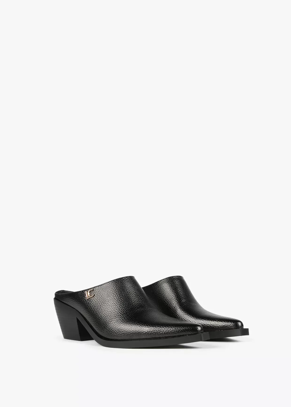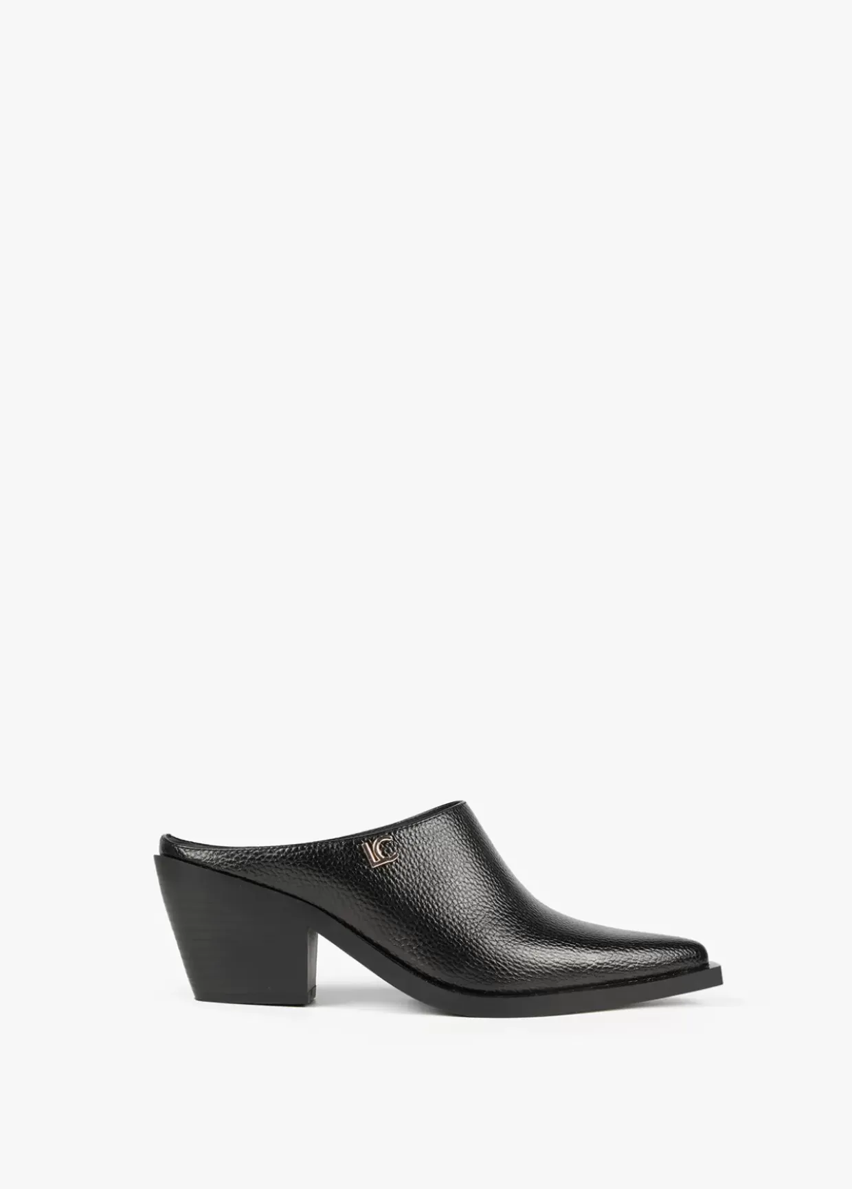Zueco negro con punta estilo cowboy. Letra logotipo dorada en lateral. Plantilla logotipada.